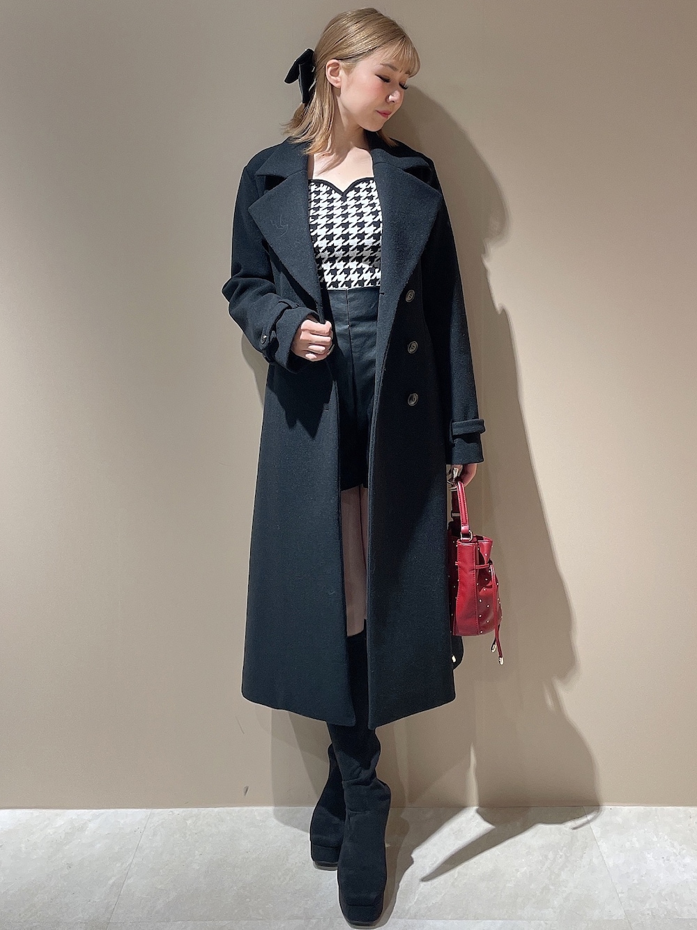 冬のミニ丈♡ロングコート×ロングブーツで寒くないコーディネート♡ 【コート】大きめの襟と短めの丈感が特徴的なコートです!150cm前半の方もヒール無しで着用可能です◎シンプルなデザインなので、プライベートとお仕事どちらでも使いやすいです! 【トップス】人気のハートネックデザインです!ニットなのできつくは無いですが、ピタッとした着心地で着膨れせずスッキリとした印象になります♪ 【パンツ】ベーシックでな作りで、トップスの合わせ方に困りません!かなりハイウエストなので、トップスをインして頂くと脚長効果抜群です♡ 【ブーツ】細見えが叶う流行りのデザインです♪ふくらはぎにピタッとすることで脚が細く見え、美脚効果が期待できます!ソール部分にも厚みがあるので、歩きやすさ抜群です◎普段23.5cmでMサイズがピッタリでした!
