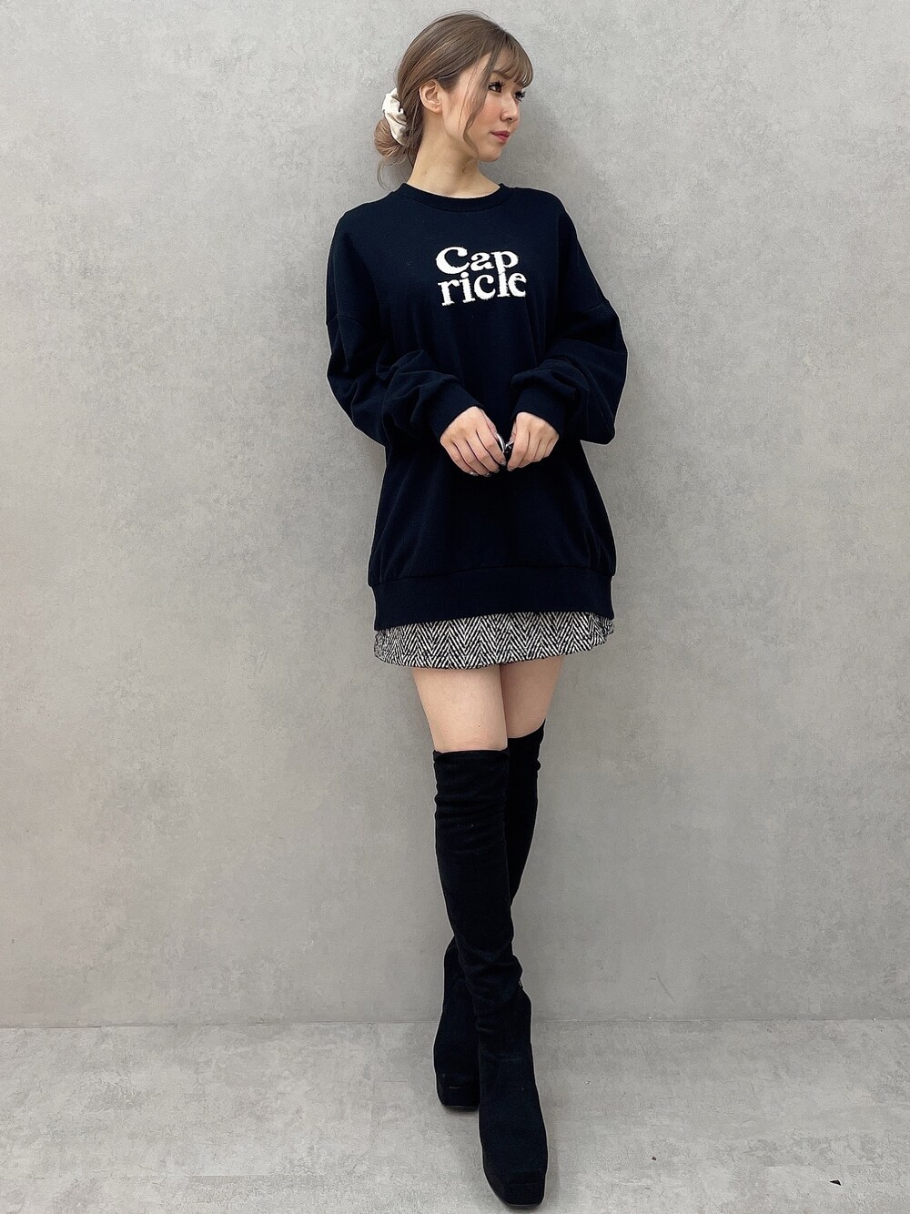 ちょっぴりラフなニーハイコーデ♡ 【スウェット】162cmで1枚で着るとギリギリの丈感なので、高身長さんはショーパンがマストになってきます◎低身長さんは1枚でワンピのように着るのも可愛いです♡羽織はダウンコートと相性抜群です! 【ショートパンツ】スカパンなので、ミニ丈でも安心感があります◎ウエストはゆったりしているように感じました!トップスはシンプルなアイテムがオススメです♪ 【ブーツ】圧倒的に盛れるニーハイブーツです♡ふくらはぎにピタッとすることで脚が細く見え、美脚効果が期待できます!ソール部分にも厚みがあるので、歩きやすさ抜群です◎普段23.5cmでMサイズがピッタリでした!