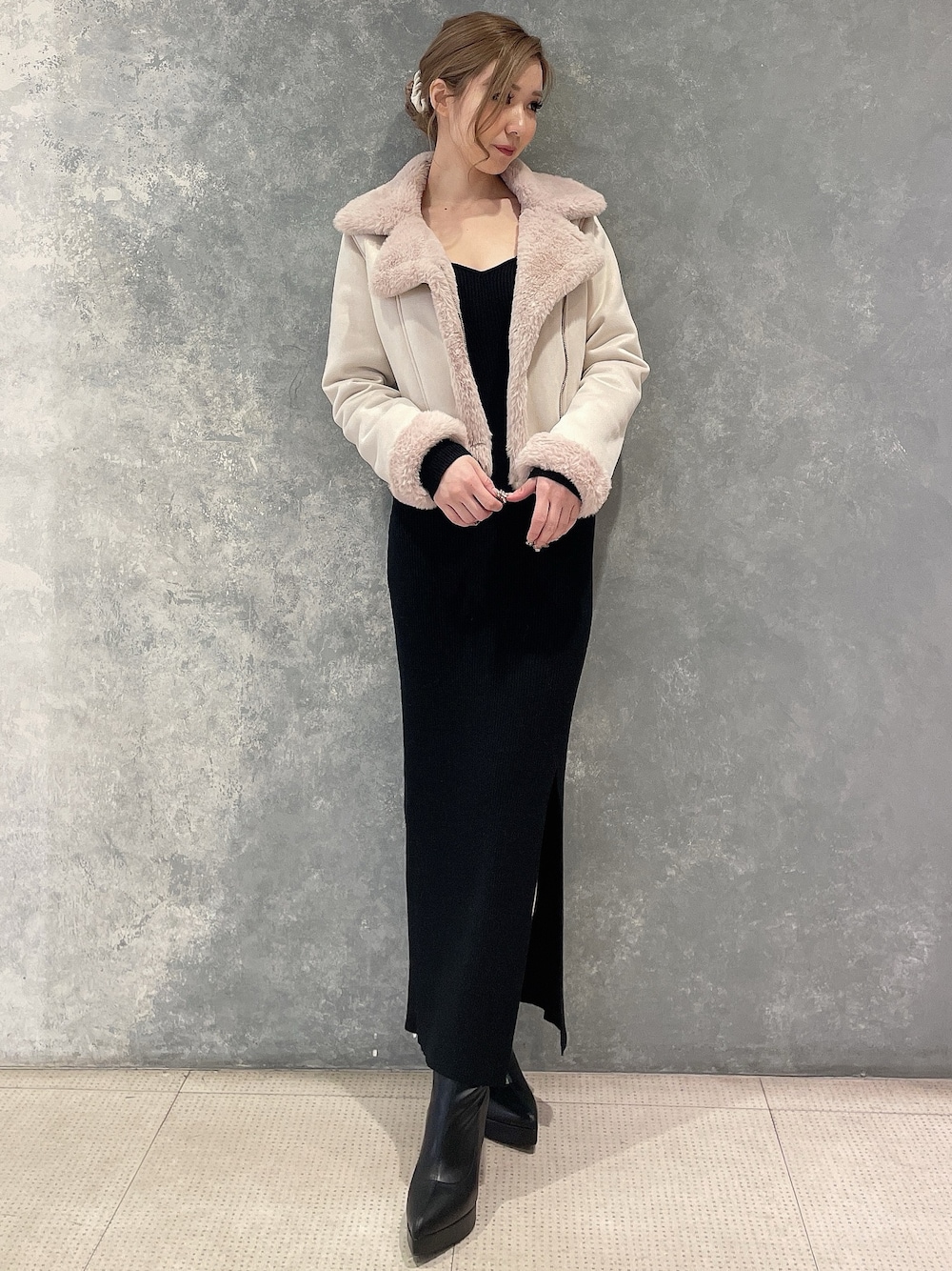 シンプルで着やすいキレイめコーディネート♡ 【ブルゾン】RESEXXY毎年大人気のショート丈ブルゾンです♡ファーのみのシンプルなデザイン性なので、キレイめ、カジュアル共に合わせやすくなっております◎内側のファーがとても気持ちよく、どこで腕まくりしても裏地がファーで綺麗ですよ♪ 【ワンピース】シンプルなデザイン性ですが、シルエットの綺麗さで人気のあるタイトワンピースです♡胸元はハートネックデザインで、少し広めに開きます!深めのスリット入りなので、ロングブーツ合わせもオススメです◎ 【ブーツ】私が店頭で愛用しているショートブーツです♡とても柔らかい素材なので、ふくらはぎが疲れにくくなっております◎普段23.5cmの私は今回Lサイズを選びました!靴下を履いて、浮腫んだ時のことを考えて少しゆとりのあるサイズを選びました♪