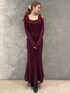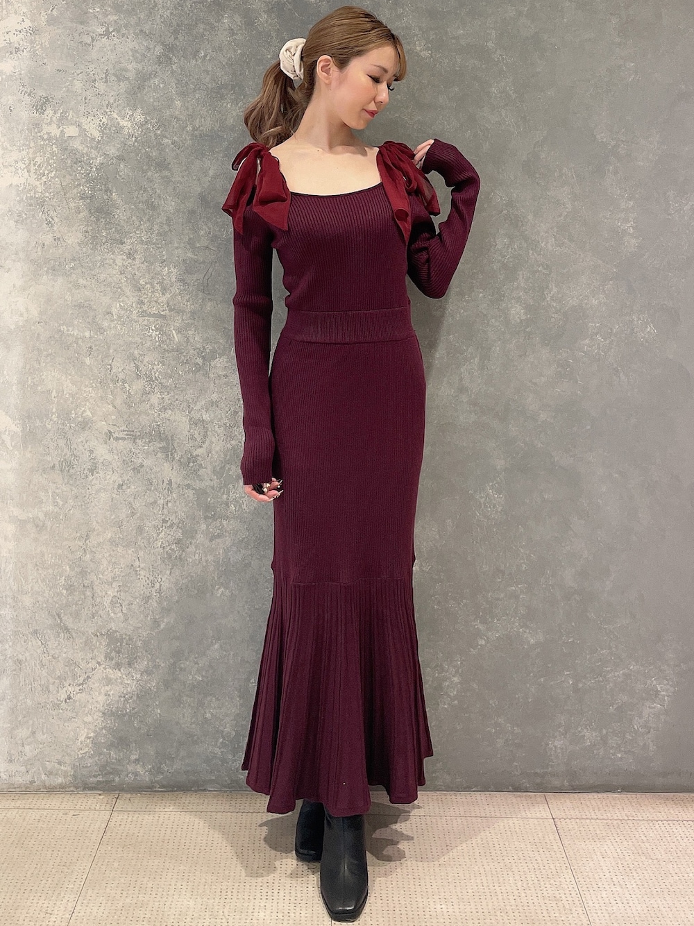 クリスマスデートにオススメ♡この時期着たいワインカラーコーデ♡ 【ワンピース】流行りのリボンが目立つマーメイドワンピース♪リボンは解けるので、自分で結び直すことが出来、デコルテの肌見せ具合を少し変えることもできます!ウエストのゴム部分にベルトをつけてあげると、より細くスッキリ見せることが出来ます◎ 【ブーツ】高さはありますが、太めのヒールで安定感のあるブーツです!ヒール初心者さんにもオススメ◎キレイめ、カジュアル共に合わせやすいです♪普段23.5cmの私はLサイズで、浮腫んだ時のためにゆとり持って履いております!