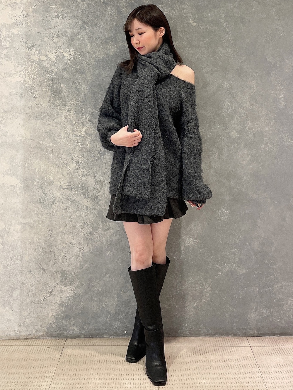 山下美月さん着用のマフラーチュニック♡ 【チュニック】オフショルやワンショルで着ることもできるゆったりニットです♡かなり暖かさがあり、真冬にも適しています◎マフラーもかなり大きめでコートの上に巻いてあげても可愛いです! 【スカート】ベルトループがついているので、流行りのチェーンをつけたりベルトを通していただくのがオススメです◎インナーはついてません! 【ブーツ】ふくらはぎに圧迫感がなく、カジュアルな雰囲気にも合わせていただけるブーツです♪普段23.5cmの私はLサイズが履きやすかったです!
