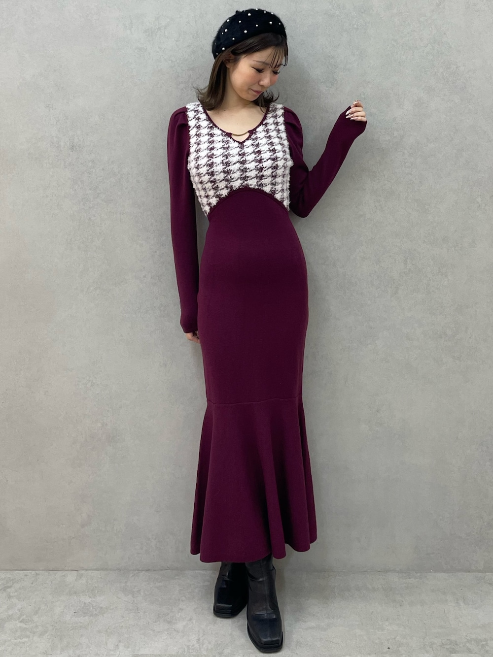 moeka(RESEXXY)のワンピース「ハウンドトゥースマーメイドニットワンピース」を使ったコーディネート