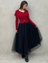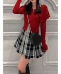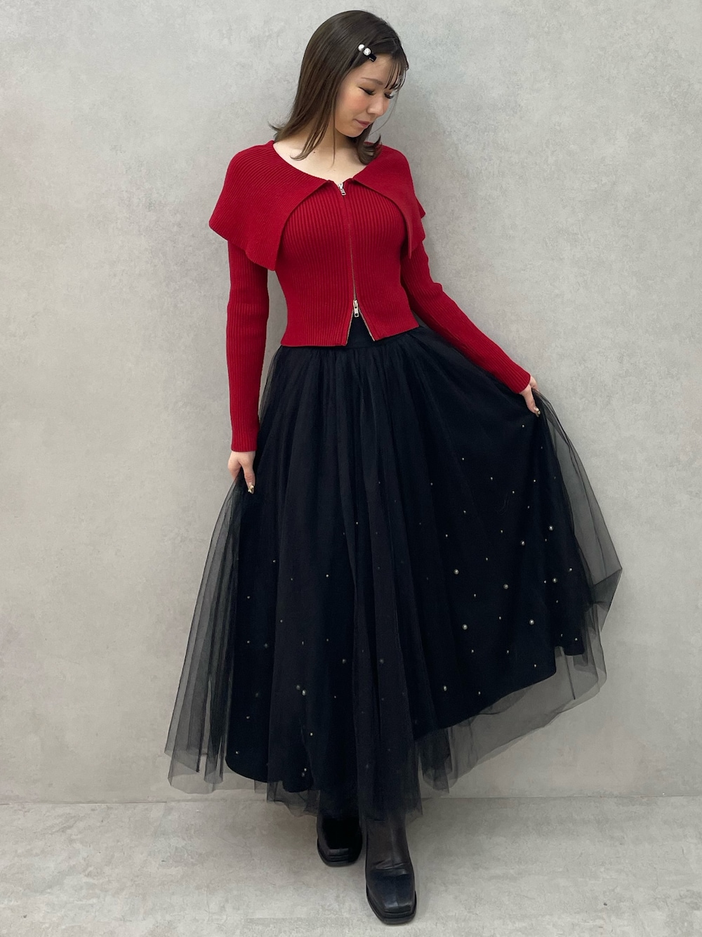 クリスマスはもちろん、普段使いもしやすいレッドカラーコーデ。 【トップス】ジップを調節することで、肌見せ加減を変えることが出来ます!お腹をチラッと見せたり、オフショルにしたり楽しめます◎デニム系のカジュアルスタイルもオススメです! 【スカート】パールがちりばめられた高見えするデザインです!ウエスト部分はコルセットデザインなので、トップスをインするスタイルも脚長効果がありオススメです! 【ブーツ】流行りのふくらはぎピタッとデザインです!ストレッチ性があるので、浮腫んだ時も履きやすく、嫌な肉感を拾いずらいのがおすすめな点です◎太めなヒールで安定感も抜群です!