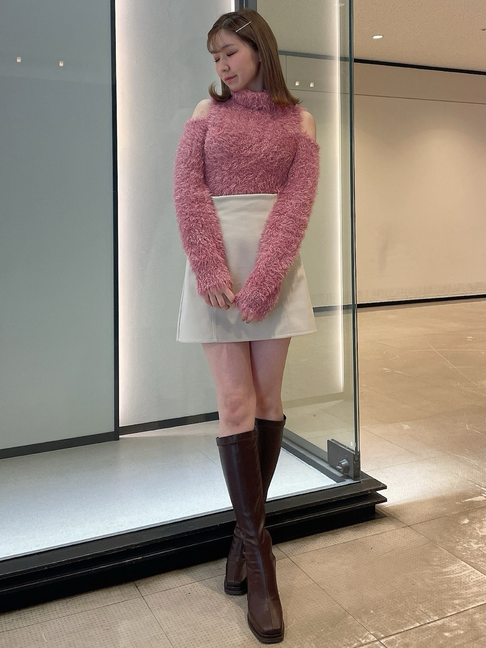 女の子らしいピンクが映えるミニ丈コーデ♡ 【トップス】オープンショルダーで肌見せがあるので、シャギーでも着膨れが防げます◎ラメが入っていますが、着心地はチクチクとした感じがしないのでかゆくならず着やすいです! 【スカート】インナーパンツがついています◎台形の形をしているので、太もも周りをスッキリ見せてくれます!トップスはインするか、チュニック系のインナーとして履いていただくのがオススメです◎ 【ブーツ】流行りのふくらはぎピタッとデザインです!ストレッチ性があるので、浮腫んだ時も履きやすく、嫌な肉感を拾いずらいのがおすすめな点です◎太めなヒールで安定感も抜群です!