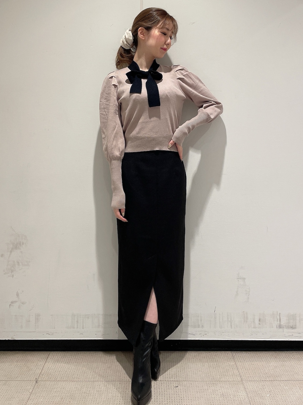 【トップス】手首がキュッとしているので、二の腕をカバーしつつも細見えしてくれます♡インしても、インしなくてもスッキリ見えるデザインです!春先に着るのもオススメです♪ 【スカート】スリット入りなので、足さばきが良く歩きやすさ◎です!シンプルなデザインで、お仕事の場面にも使いやすいです♪ 【ブーツ】私が店頭で愛用しているショートブーツです♡とても柔らかい素材なので、ふくらはぎが疲れにくくなっております◎普段23.5cmの私は今回Lサイズを選びました!靴下を履いて、浮腫んだ時のことを考えて少しゆとりのあるサイズを選びました♪