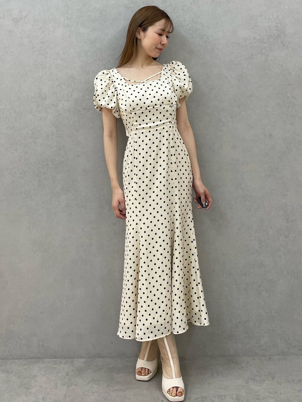 【ワンピース】去年大人気を頂いて話題になったドット柄ワンピースが、サイズ展開をご用意して今年も発売します!162cmで今回はSサイズを着用してみました◎足首より少しだけ上の丈感になります!低身長さんはヒールがあるとより安心です◎インナーは幅の広いものでなければ、隠して着用可能です! 【ブーツ】暖かくなってきたら履きたいオープントゥデザインです♡通気性が良い点がおすすめポイント◎ミニ丈のアイテムとも合わせやすいです!普段23.5cmの私はMサイズが丁度でした!