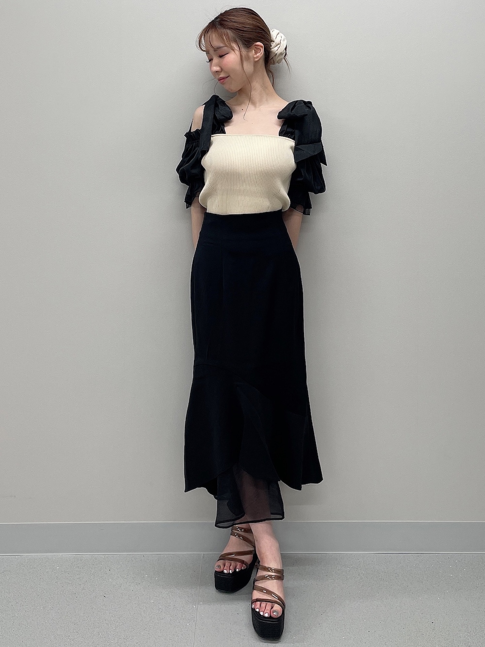【トップス】程よい肌見せが可愛いリボンニットです♡リボンは大きく広めに結んであげるのがオススメです!ストラップは細いものでしたら、リボンの部分に隠してあげても大丈夫です◎ 【スカート】RESEXXYでロングヒット中のシアーマーメイドスカートです♡裾シアーデザインのおかげで、重たく見えず足元涼しげに見せてくれます♡Tシャツ合わせや、スニーカーにもぴったりで着回ししやすいです◎ 【サンダル】RESEXXY毎年大人気のウェッジサンダルです!デニム系、ワンピース系など幅広く合わせられます♪厚底なので、高低差も無く痛くなりにくいのが特徴です!普段23.5cmの私はMサイズが丁度良かったです◎