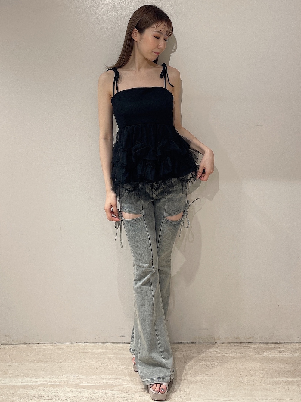 moeka(RESEXXY)のキャミソール「チュールフリルペプラムキャミトップス」を使ったコーディネート