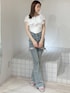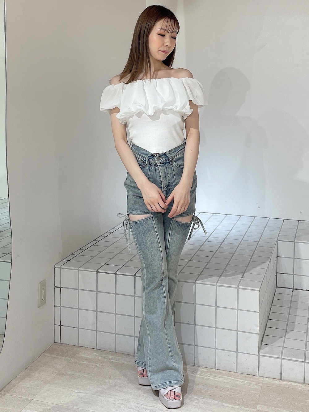 【トップス】シアーのくしゅくしゅが可愛いオフショルニットです♡肩周り伸縮性が抜群なので、肩上げて着用することもできました!着用しているカラーは薄いお色や肌馴染みの良い色味のインナーがオススメです! 【デニム】大好評のデニムパンツ!162cmでMサイズ着用してみました!低めのヒールですと、少し膝下があまりような感じがありました。ウエストやヒップはSサイズより2cmずつ大きくなります! 【サンダル】去年も人気頂いた、厚底で高低差がない楽ちんサンダルです!今年は新色でベージュが出ました♪肌なじみの良いグレージュのような色味が可愛いです♡23.5cmの私はMサイズがちょうど良かったです!