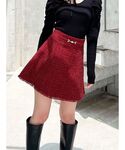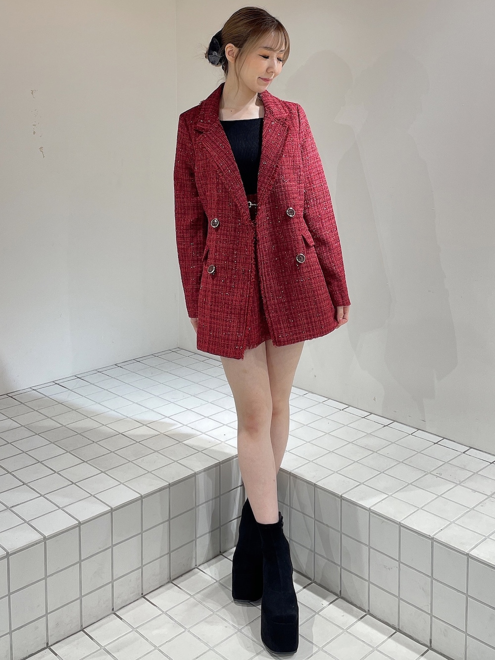 【ジャケット】秋冬に可愛いツイードジャケット♡ラメラメ感がとっても映えて可愛いです♡お値段以上に高見えするツイード素材なので、合わせるアイテムはベーシックな中ものがオススメです!丈は162cmでヒップがスッキリ隠れます!これからイルミネーションの時期にもオススメです♪ 【スカート】チェーン部分がハートになっているのが可愛らしいです♡インナーパンツ付きなので、ハイウエストでミニでも履きやすいです!台形のシルエットなので、自然とヒップがカバーできます◎ 【トップス】スクエアネックでデコルテが綺麗に見えるシンプルニットです◎胸元は開きすぎないので、華奢な方にもオススメです!長さはしっかりインできるぐらい着丈はあります! 【ブーツ】とにかく盛れます♡圧倒的な高さと軽さがイチオシポイントのブーツです!ヒールは12.5~13cmとなっており、脚長効果抜群です♡高低差が緩いので、ヒール初心者さんにもオススメです◎