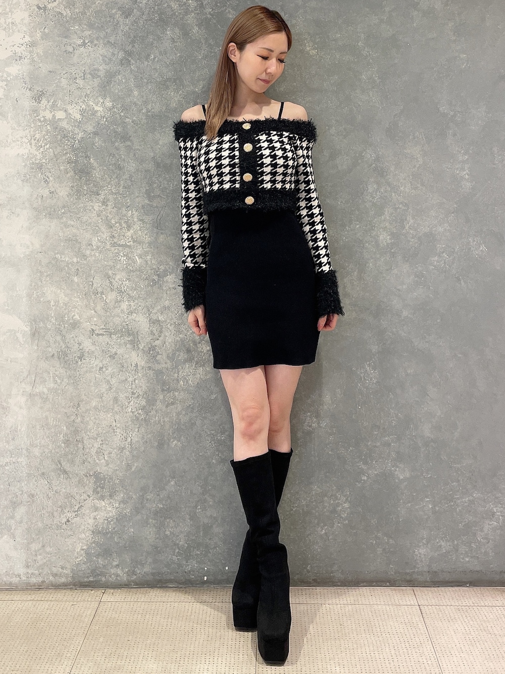 【ワンピース】ハッキリとした千鳥柄とファーが可愛いデートワンピースです♡キャミワンピースの上にシャギートップスを重ねて着ていただきます◎生地はかゆくなったり、チクチクしたりしないので着心地も良かったです!肩紐は調整できるので、身長に合わせて変えていただけます!162cmの私も余裕のある丈感でした◎ 【ブーツ】脚長効果抜群の美脚ブーツです♥厚底ですが、重たすぎないので歩いてて疲れにくいです!ゆとりあるサイズ感より、ピタッと履いた方がふくらはぎは細く見えやすいです♥普段23.5cmの私はMサイズを選びました!