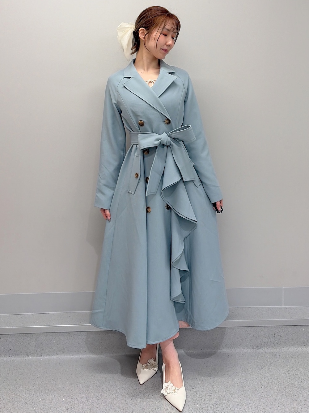 【コート】珍しいフリルデザインが可愛らしいトレンチです♡コートの端が波のようなフリルで、とても立体感があります!ベルトループは無いので、ベルトを付けずに着ていただくこともできます! 【ヘアアクセサリー】大きめのリボンが存在感たっぷりで可愛らしいバレッタです♡ポニーテールやハーフアップして付けるのも可愛いです♡ 【ヒール】お花のデザインはクリップで取り外しが可能になっております!23.5cmの私はMサイズで丁度良かったです◎先は見た目細くなっていますが、つま先はたって痛いような感じはなかったです!
