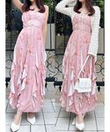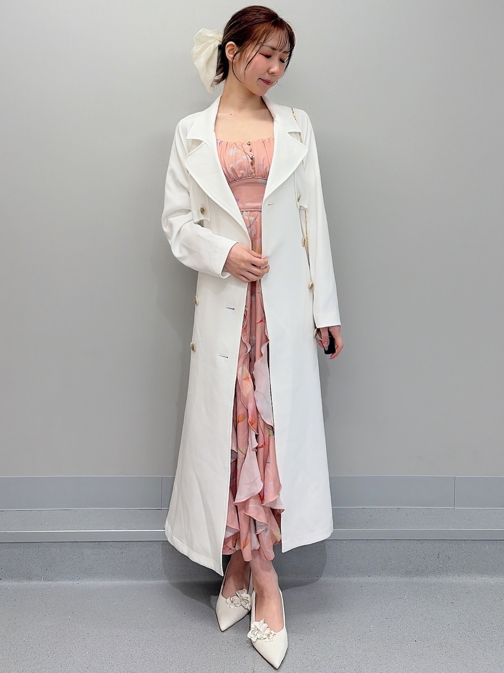 【ワンピース】キャミワンピースとボレロのセットアイテムです♡スカート部分は生地が重なっているので、歩いた時の揺れ感やフリルの立体感がとても上品に見えます♪ワンピースは肩紐が調整できます!ボレロは薄手の透ける素材なので風通しも良く、暖かくなった時期にぴったりです◎着用しているオレンジはピンクっぽさも強いです! 【コート】毎年大人気♡サイドがシアー素材のトレンチコートです!前は開けても閉めても着ていただけますが、閉じた方がプリーツは幅広く見せられます◎ホワイトはサイドのシアー部分から中物のお洋服が少し透けます! 【バック】斜めがけ出来るチェーンか、バックと同色の持ち手の2種類です!3色とも春らしい色味で、これからの時期にぴったりです♡ 【ヘアアクセサリー】大きめのリボンが存在感たっぷりで可愛らしいバレッタです♡ポニーテールやハーフアップして付けるのも可愛いです♡ 【ヒール】お花のデザインはクリップで取り外しが可能になっております!23.5cmの私はMサイズで丁度良かったです◎先は見た目細くなっていますが、つま先は立って痛いような感じはなかったです!