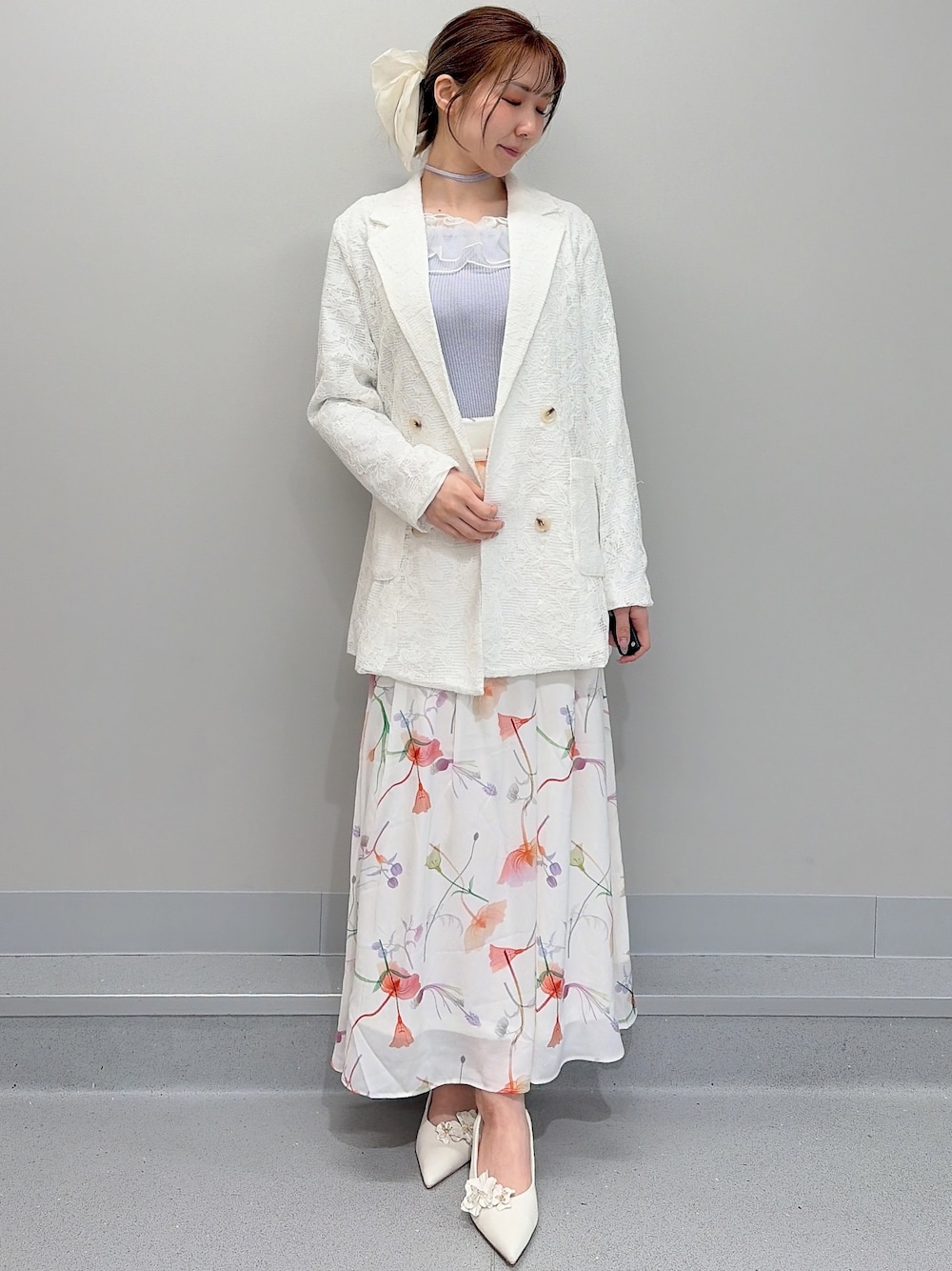 【ジャケット】珍しい表面が総レースのジャケットです♡生地は薄すぎず、しっかりとした生地感なので、これから気温が上がってきたら活躍してくれます◎162cmでヒップがしっかり隠れる丈感で、ミニ丈のボトムスと合わせるとボトムスの丈が少し見えるような長さでした! 【トップス】チョーカー付きのオフショルニットです♡ラベンダーは薄めの色味で、春に使いやすいです!ホワイトは少し透け感があるので、インナーはお肌に近い色味がオススメです!チョーカーの結び方はお好みで変えていただけます!ただ縫われているので、取り外しはできません! 【スカート】memorif×RESEXXYコラボレーションアイテムです♡広がりすぎないフレアシルエットなので、下半身カバーしつつ着膨れしにくいです◎着用しているホワイトは裏地がしっかりついているので、透けにくいです! 【ヘアアクセサリー】大きめのリボンが存在感たっぷりで可愛らしいバレッタです♡ポニーテールやハーフアップして付けるのも可愛いです♡ 【ヒール】お花のデザインはクリップで取り外しが可能になっております!23.5cmの私はMサイズで丁度良かったです◎先は見た目細くなっていますが、つま先はたって痛いような感じはなかったです!