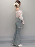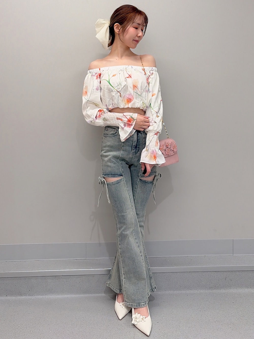 【トップス】memorif×RESEXXYコラボレーションアイテムです♡フリーサイズですが、短めの丈感でコンパクトなサイズ感です!手首がキュッとしているので、腕周りもスッキリ見せてくれます◎ 【デニム】大バズりのリボンデニムです♡162cmでXSを着用してみました!丈はヒールを履かなくても、引きずらずに着用できます!春夏に明るい色味のトップスと合わせると、アイスブルーはより相性良くてオススメです♡ 【ヘアアクセサリー】大きめのリボンが存在感たっぷりで可愛らしいバレッタです♡ポニーテールやハーフアップして付けるのも可愛いです♡ 【ヒール】お花のデザインはクリップで取り外しが可能になっております!23.5cmの私はMサイズで丁度良かったです◎先は見た目細くなっていますが、つま先はたって痛いような感じはなかったです! 【バック】斜めがけ出来るチェーンか、バックと同色の持ち手の2種類です!3色とも春らしい色味で、これからの時期にぴったりです♡