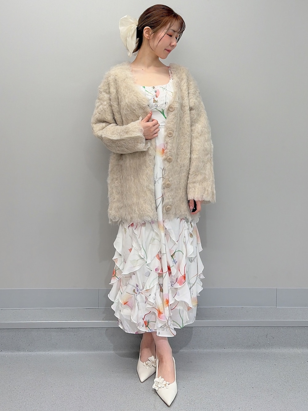 【ワンピース】キャミワンピースとボレロのセットアイテムです♡スカート部分は生地が重なっているので、歩いた時の揺れ感やフリルの立体感がとても上品に見えます♪ワンピースは肩紐が調整できます!今は着用していませんが、セットのボレロは薄手の透ける素材なので風通しも良く、暖かくなった時期にぴったりです◎ 【カーディガン】ゆったりとした着心地で、とっても暖かい着心地でした♡フレアスカートやワンピースなど豊富な着回しが楽しめます!カーディガンの上にアウターを着る時は、ダウンなど腕周りがゆったりしたものがオススメです◎ 【ヘアアクセサリー】大きめのリボンが存在感たっぷりで可愛らしいバレッタです♡ポニーテールやハーフアップして付けるのも可愛いです♡ 【ヒール】お花のデザインはクリップで取り外しが可能になっております!23.5cmの私はMサイズで丁度良かったです◎先は見た目細くなっていますが、つま先はたって痛いような感じはなかったです!