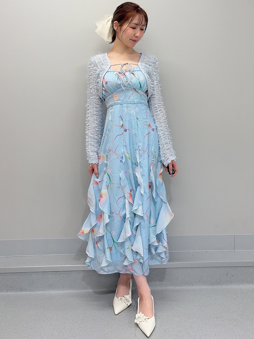 【ワンピース】キャミワンピースとボレロのセットアイテムです♡スカート部分は生地が重なっているので、歩いた時の揺れ感やフリルの立体感がとても上品に見えます♪ワンピースは肩紐が調整できます!ボレロは薄手の透ける素材なので風通しも良く、暖かくなった時期にぴったりです◎ 【ヘアアクセサリー】大きめのリボンが存在感たっぷりで可愛らしいバレッタです♡ポニーテールやハーフアップして付けるのも可愛いです♡ 【ヒール】お花のデザインはクリップで取り外しが可能になっております!23.5cmの私はMサイズで丁度良かったです◎先は見た目細くなっていますが、つま先はたって痛いような感じはなかったです!