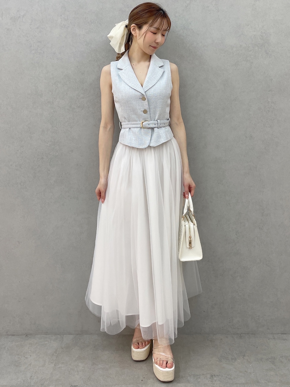 【ワンピース】3wayで使えるアイテムです!ベストとスカートを合わせてワンピースのように着ていただくか、ベストだけ、スカートだけでも春夏お使いいただけます♡スカートはウエスト周り全部ゴムでかなり伸びるので、フリーサイズでも凄い履きやすかったです!春夏仕様のツイードなので、生地はしっかりしつつ薄い生地感です! 【サンダル】今年も発売♡毎年大好評でスタッフも購入している厚底サンダルです♪23.5cmの私はMサイズでぴったりです!高低差はかなり緩やかなので、長時間履いてても痛くなりにくいです◎ 【バック】コンパクトな見た目で、しっかり容量の入るスクエアハンドバックです!マチがしっかりあるので、サラッとお出かけに使いやすいです◎ショルダーを付けて、持ち運びもできます! 【ヘアアクセサリー】大きめのリボンが存在感たっぷりで可愛らしいバレッタです♡ポニーテールやハーフアップして付けるのも可愛いです♡