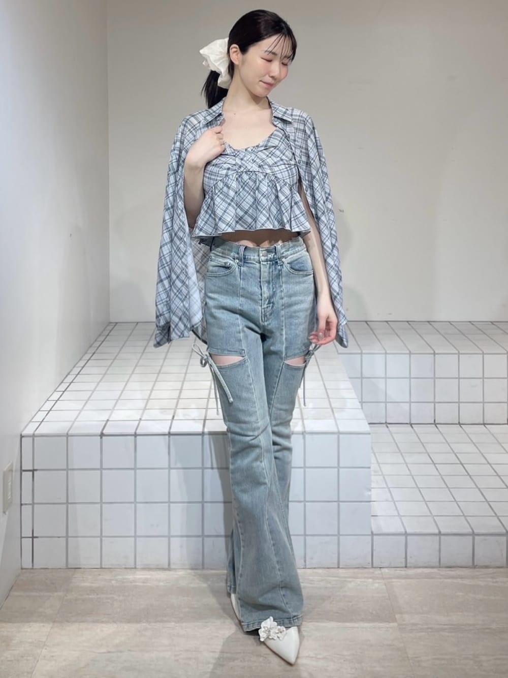 【キャミソール】リボンデザインがインパクトのあるキャミソールです♡肩紐は調整ができるので、身長に合わせて変えていただけます!パットなどは付いていません◎Tシャツなどの上に重ねて着ていただくのも可愛いです♡ 【シャツ】ヒップが隠れる丈感のシャツです!夏の日除けや肌見せを隠したいときに使いやすい羽織りです◎ 【デニム】ロングヒット中のカットリボンデニムです♡162cmでSサイズを着用しております!丈はヒール無しだとかかとギリギリぐらいの丈感です!意外と伸びるのと、履いてくうちに自分の脚に合ってくるので、ピタッとしたサイズ感で購入いただくのがオススメです! 【ヒール】お花のデザインはクリップで取り外しが可能になっております!23.5cmの私はMサイズで丁度良かったです◎先は見た目細くなっていますが、つま先はたって痛いような感じはなかったです! 【シュシュ】かなり大きめで、ボリューム感のあるシュシュです!髪型も華やかに見えるので気に入ってつけています♪