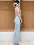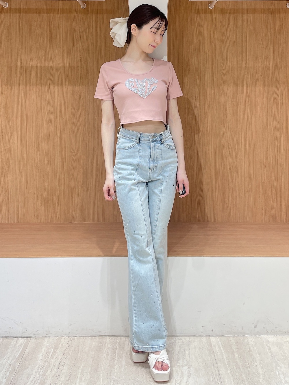 【Tシャツ】コンパクトでピタッとしたサイズ感のTシャツです♡スパンコールがどこから見てもしっかりキラキラしているので、どの色味も映えます◎5.6枚目は加工無しでこのキラキラ感です♡ 【デニム】ロングヒット中のフレアデニムに、ストーンが施された可愛らしいデザインです♡画像では少し見にくいですが、ウエスト下、膝周り、ふくらはぎ部分にストーンが散りばめられています♡162cmでMサイズを着用しました!かかと辺りの丈感で、長めの丈は脚が長く見えてオススメです! 【サンダル】今年も発売♡履きやすさ抜群の厚底サンダルです!ぷにっとしたクッション性に優れているので長時間履いてても疲れにくいです!高低差も緩やかで、足の甲が痛くなりずらいのも嬉しいポイントです◎太めのストラップ付きで、ミニ丈と合わせた時の脚が出過ぎてる感が緩和できてオススメです! 【ヘアアクセサリー】大きめのリボンが存在感たっぷりで可愛らしいバレッタです♡ポニーテールやハーフアップして付けるのも可愛いです♡