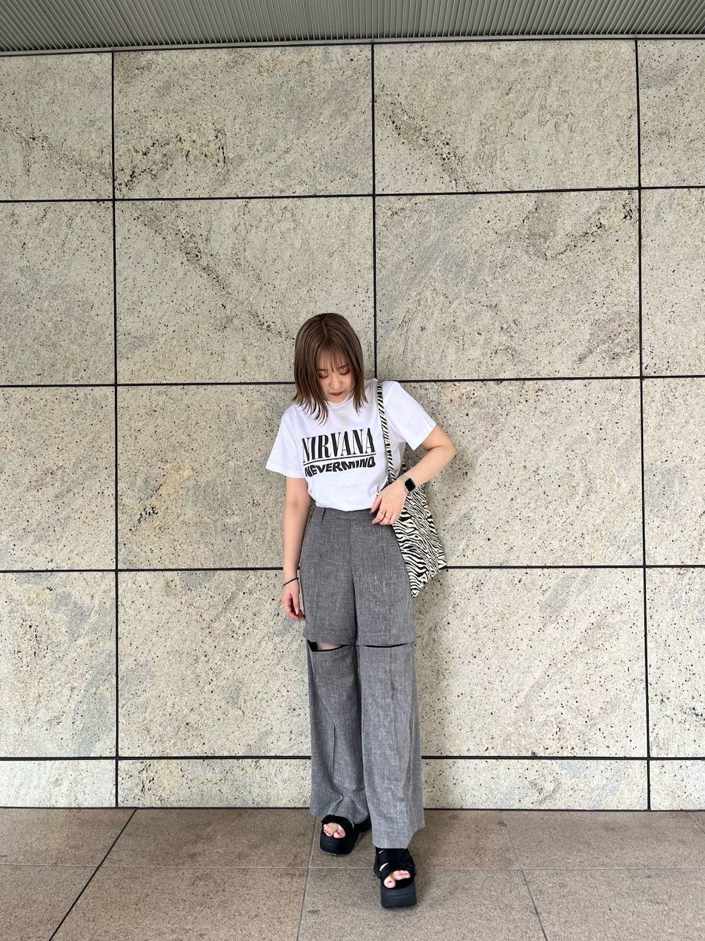 【トップス】NIRVANAプリントTシャツ バックプリントはNIRVANAの2ndアルバム ネバーマインドの曲目が並んでます♩ オーバーサイズのゆるいシルエットが体型カバーも出来てボトムを選ばず着回しできます! 【パンツ】トレンドのローライズパンツ♡チャックが付いていて取り外してハーフパンツでも使える3WAY仕様です!!これからの時期にぴったり❕ゆるっと履きたかったのでMサイズ着用しております。 【サンダル】毎年大人気のSHAKAコラボサンダル❤︎ヒールストラップが外せるので2WAY仕様です!ボリューム感が他にはないデザインでクッション性が高いので履き心地抜群◎少し大きめなので普段24.5cm で24履いてます。ルーズソックスなどに合わせたい方は25でも◎ 【バッグ】柔らかい質感のフェイクレザーを使用したトートバッグ👜A4サイズが入る縦長の大きさでデイリー使いしやすい! 持ち手が長めなので肩にかけやすいです♡