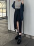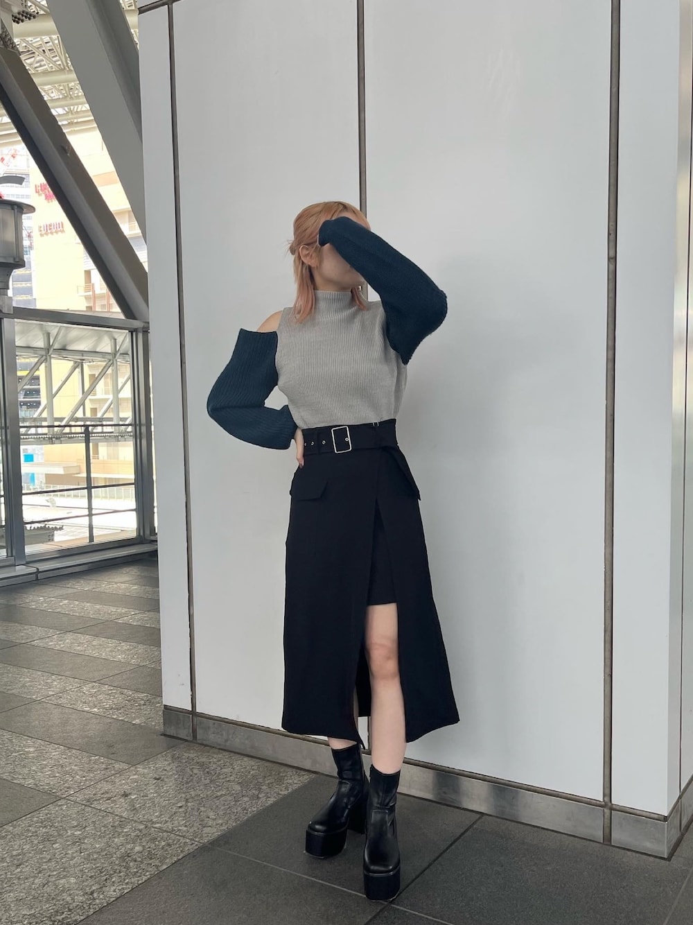 【knit】1枚で決まるデザインニット。 肩のカッティングデザインとバイカラーの配色がポイントです。 【skirt】MURUA定番のラップスカート!とにかくAラインのシルエットが綺麗で骨盤や腰回りをカバーしてくれます。大胆なスリットがヌケ感を演出。普段ミニスカート履かない方でも挑戦しやすいスカートです!【boots】プラットフォームデザインが安定感があり歩きやすい一足。しっかり高さがあるので足を綺麗に見せてくれるので感動しました!