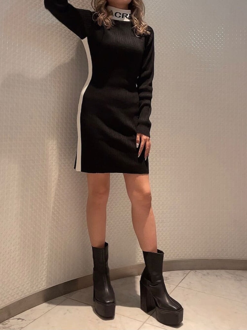女性らしいラインが出るGYDAらしいタイトなワンピース! 両サイドのラインがさらにウエストを細く見せてくれます! 後ろの首元にジップが施されているのでとっても着やすい1着です!