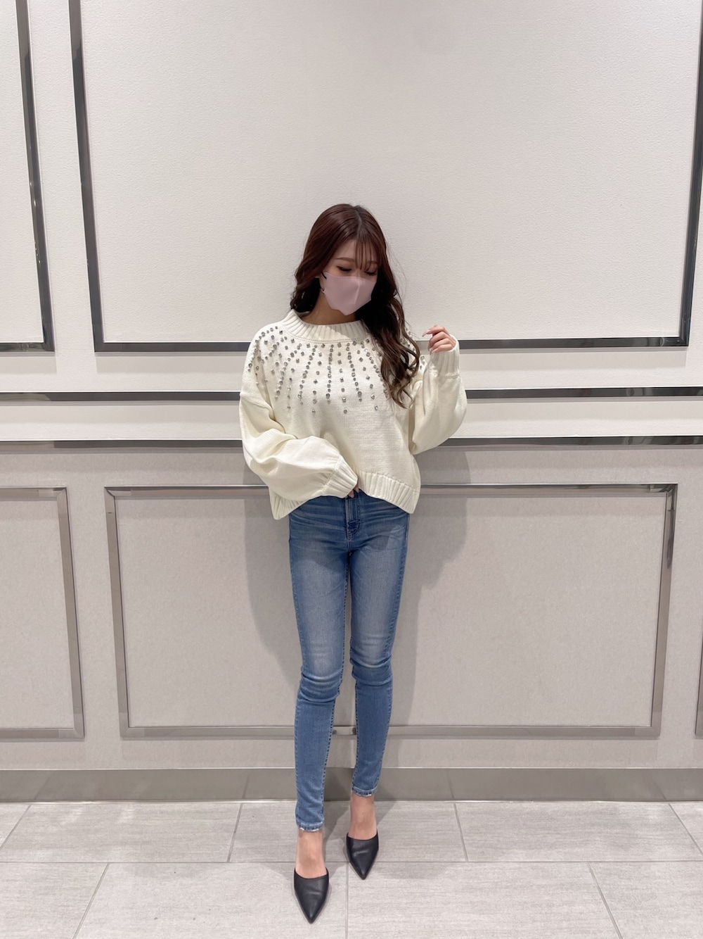 デートにピッタリのキレイめカジュアルコーデ♡ 【tops】ミックスされたビジューが甘くなり過ぎず、上品さもありカジュアル感もあるので、色々な雰囲気で着用頂けます◎ 程よいショート丈がタイルアップ効果抜群です◎ 今回は、薄い色のデニムのノーダメージを合わせ、大人デートコーデにしてみました♡