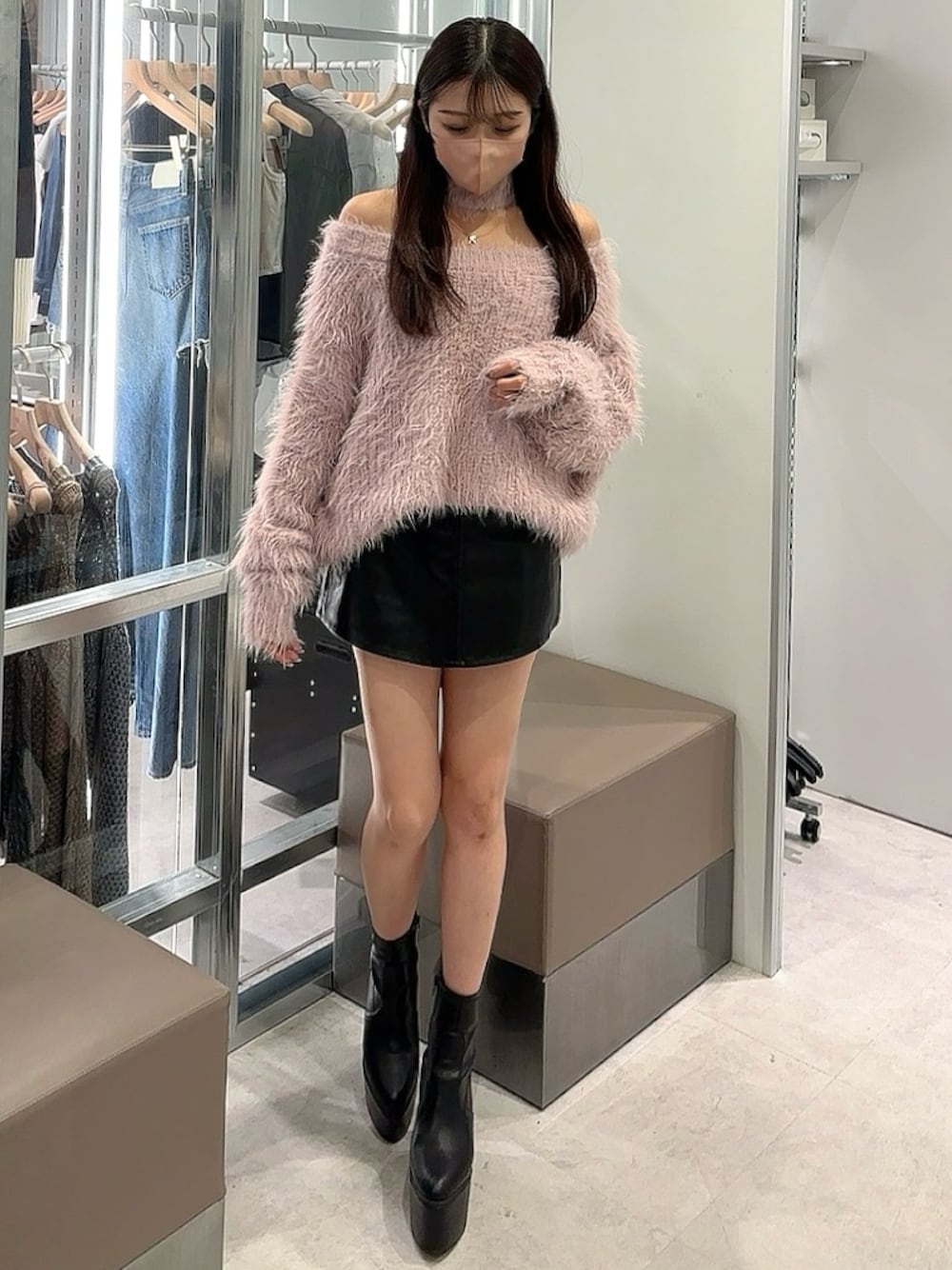 甘くなりすぎないデートコーデ♡ 【トップス】GYDAで毎年人気のシャギーニット!!2wayになっていて、どちらを前にしても着用できます◎ ふわふわでサラッとした素材がチクチクせず、ストレスフリーで着用できます!! オフショルは程よいリブになっていて、キツすぎずゆるすぎないのがポイントです!! 【スカート】インナーが入っているのと、後ろが少し長めの丈でサイドは前と後ろより少しになっているので、横から見ても脚長効果抜群です◎ 【ブーツ】ヒールとつま先がとんがったデザインが足元が重たい印象にならず、スッキリとした印象になります♡ 高低差もあまり無いので疲れにくくは歩きやすいです!!