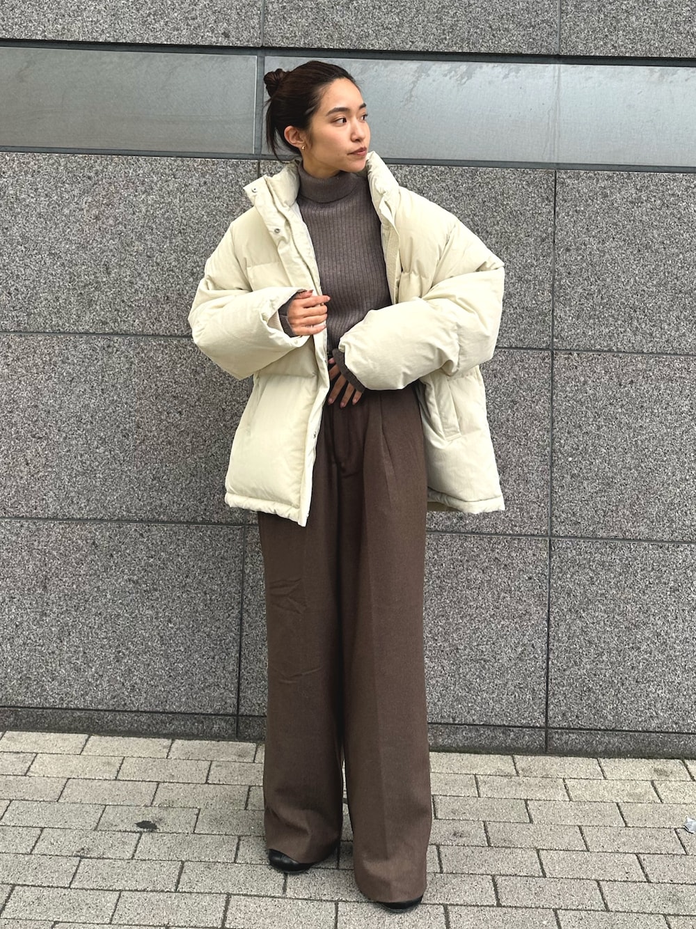 【キレイめダウンコーデ】 Instagram☞@himeka_kawamura_ 【ダウン】 少しマットな素材感なのでキレイめコーデにも合わせやすいです! 丈感もお尻まで隠れるのでタイトめなスカートなどと合わせても安心感があります◎ 何と言ってもダウンの割合が75%なので、軽くてあったかく真冬は必須アイテムです!ダブルジップになっているので色々な着方ができちゃいます✨ 【タートルニット】 着回し万能なニット🧶 そしてお家で気兼ねなくお洗濯ができちゃいます◎ チクチク感も全くないのと、アーム部分などゆとりがあるのでとても着やすいニットです♪ 【パンツ】 ウール素材が入っているので、秋冬にぴったりなパンツです! タックが入っていてキレイな印象ですが、ゆとりがあるのでカジュアル合わせも可愛いです◎ 152cmでS size着用しておりますが少し長いので、ベルトをしたりヒール合わせで工夫して履いていただくと安心です◎