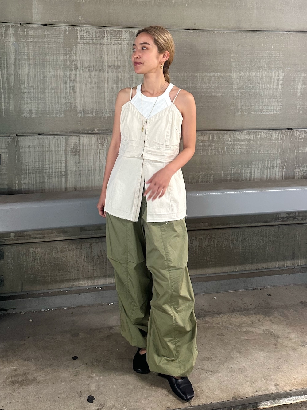 \新色デニムキャミコーデ/ Instagram☞@himeka_kawamura_ 【デニムキャミ】 去年も人気だったデニムキャミ、今年は2wayで着ていただけます! アイボリーは大人っぽくヘルシーな印象で、白Tなどと合わせると馴染みもよくおしゃれ見えします✨ 【パンツ】 ダボっと感が可愛いミリタリーパンツです! ウエストと裾が絞れるので低身長さんも引きずらずに履いていただけます! ボリュームはあるので、スッキリなトップス合わせがオススメです◎