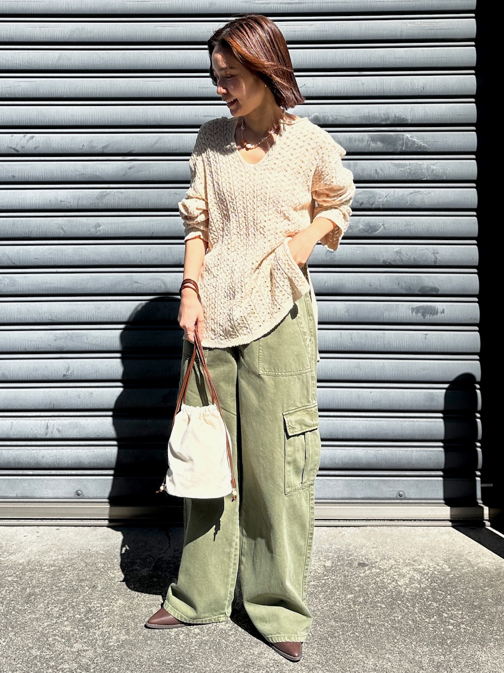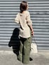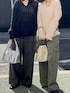 【ニット】 サイドに大きくスリットが入っている為、ボトムにインしなくてもすっきりとした見え感で着ていただけます! 少し透け感があるのでカップ付きのキャミなどと合わせると安心です! お尻も隠れるくらいの長さになっているので腰回りもカバーしつつ着用できます! 【パンツ】 少し色褪せたような質感で大人なカーゴパンツになっています! ウエストは紐で調節できるのと、ベルトループもついてるので安心です! 152cmでこの時はヒール5cmほどで合わせて写真ぐらいの長さになります! スニーカーやフラットシューズ合わせの際はロールアップなど工夫していただくのがオススメです! 【バック】 方にかけたり、手に持ったり、ナップザックのように使ったり、色々な使い方ができるバッグです! お財布、スマホ、ハンカチなどが入るぐらいの割とコンパクトなサイズになっています!