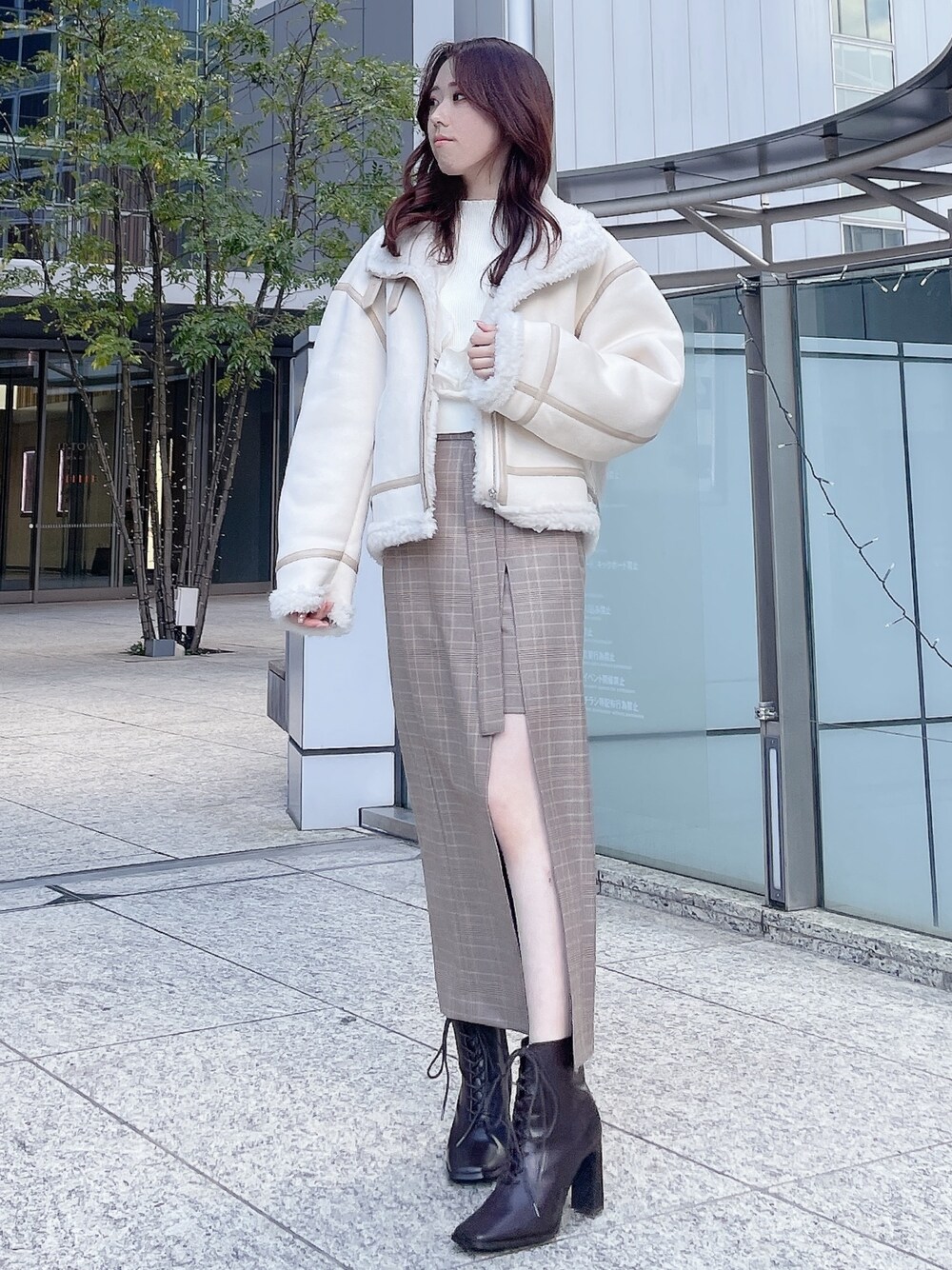 🌟カジュアルコーデ🌟 ・ニット→大人気異素材ドッキングワンピースのトップスバージョンとして登場!! 肩を落としてオフショルとしても,落とさず着ても◎ 袖に透け感があるので抜け感も出ます! 短丈なのでハイウエストボトムスのと相性抜群です!✨ 前が少し短くなっているので横から見た時のバランスもきれい!☺️ ・スカート→深いスリットが入ったトレンドのペンシルスカート! 中はミニスカートがドッキングされていてミニスカ感覚で着て頂けます! 片足がチラッと見えるのでミニスカートが苦手な方でもチャレンジしやすいスカートです!😉 足元はショートブーツはもちろんロングブーツでおしゃれに合わせても◎ ・アウター→毎年大人気のアウター✨ 短丈でお洋服選びに困らないアウターです! 後ろが少し長めになっていて158センチMサイズ着用で少しお尻が隠れる丈感です! とても軽くて袖口も広いので分厚いニットも入ります!🧶 きれいめからカジュアルまで幅広いコーデが楽しめるアウターです!