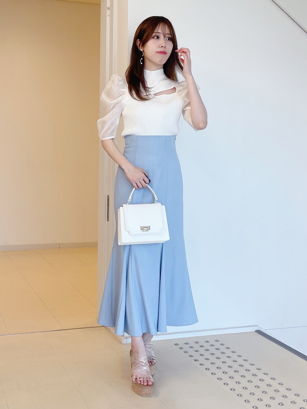 AMI(MERCURYDUO)のニット/セーター「2WAY異素材パフスリーブカットアウトニット」を使ったコーディネート