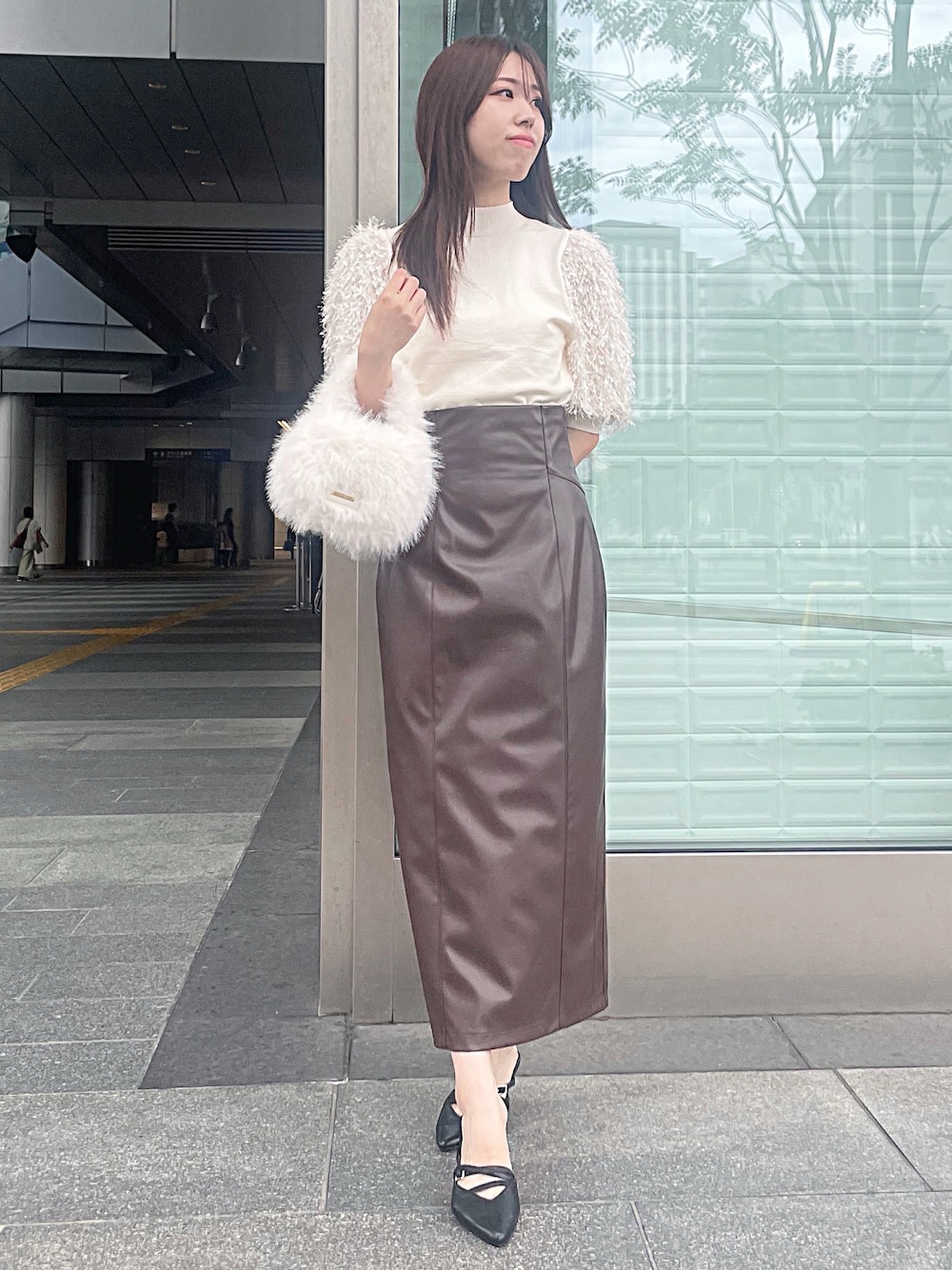 🤍大人デートコーデ🤎 ・ニット→肩のふわふわなデザインがポイントのニット! 身頃はスッキリとしていてライン綺麗に見せてくれます!✨️ ・スカート→秋冬にピッタリなスカート🍁🍂 フェイクレザーで大人な雰囲気に! ・パンプス→トレンドのビジュー付きパンプス! 合わせるだけで一気に抜け感の出るアイテム! 𝐈𝐧𝐬𝐭𝐚𝐠𝐫𝐚𝐦⇒@mercuryduo_ami