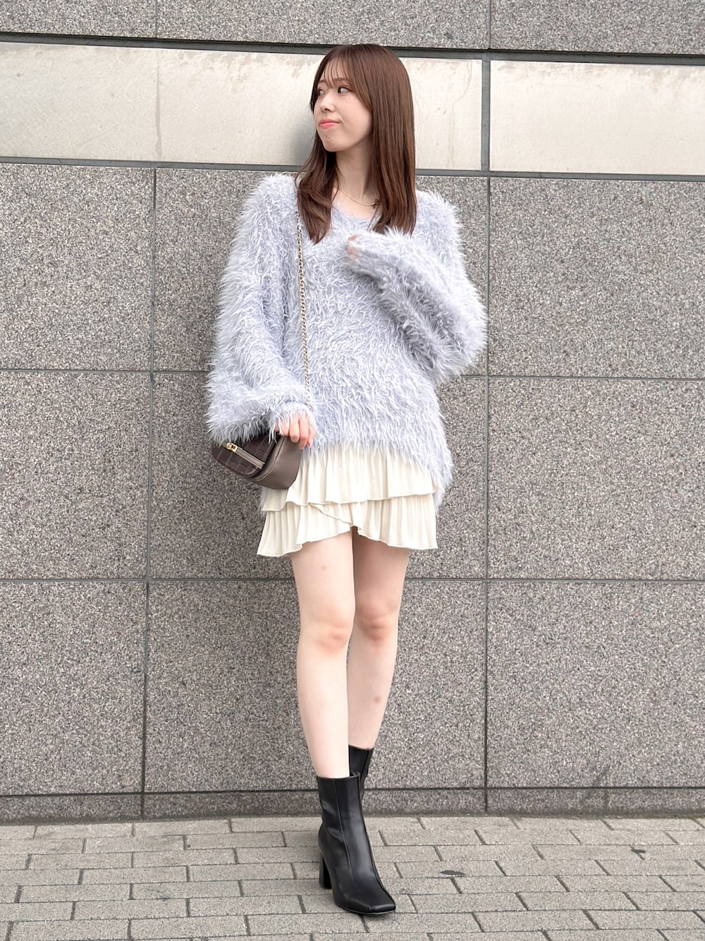 🩶トレンドコーデ🤍 ・ニット⇒ふわふわで柔らかい生地のニット! チクチクしないのが嬉しいポイント✨️ 前が短く後ろはお尻まで隠れる丈です! ミニスカやパンツ合わせもおすすめ!🤍 ・スカート⇒トレンドのプリーツスカート! イレヘムティアードで足を綺麗に見せてくれます!!👏🏻 後ろのリボンでウエスト調節可能! 158cmでSサイズ着用です! 短すぎない丈で着て頂けます! ・ブーツ⇒ヒール部分のゴールドラインが特別感を出してくれるデザイン! スクエアなので大人な雰囲気に! 23.5cmで36着用です! 𝐈𝐧𝐬𝐭𝐚𝐠𝐫𝐚𝐦⇒@mercuryduo_ami