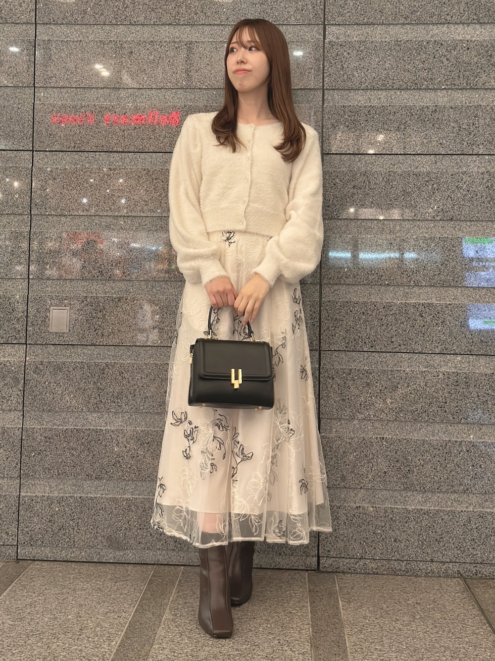 🤍ホワイトコーデ🤍 ・トップス⇒触り心地抜群のニット! カーデとしてもトップスとしても! 短丈でどんなアイテムとも合う優秀アイテム✨️ ・スカート⇒揺れる度キラッと光るラメがポイントのスカート! 繊細な花柄は刺繍デザインで女性らしい印象に💐🤍 裾に向かって広がるデザインです! 158cmでSサイズ着用です! 丈、ウエストピッタリです! ・ブーツ⇒ヒール部分のメタリックがポイント! スクエアデザインで足を綺麗に見せてくれます! 23.5cmで36着用です! 𝐈𝐧𝐬𝐭𝐚𝐠𝐫𝐚𝐦⇒@mercuryduo_ami