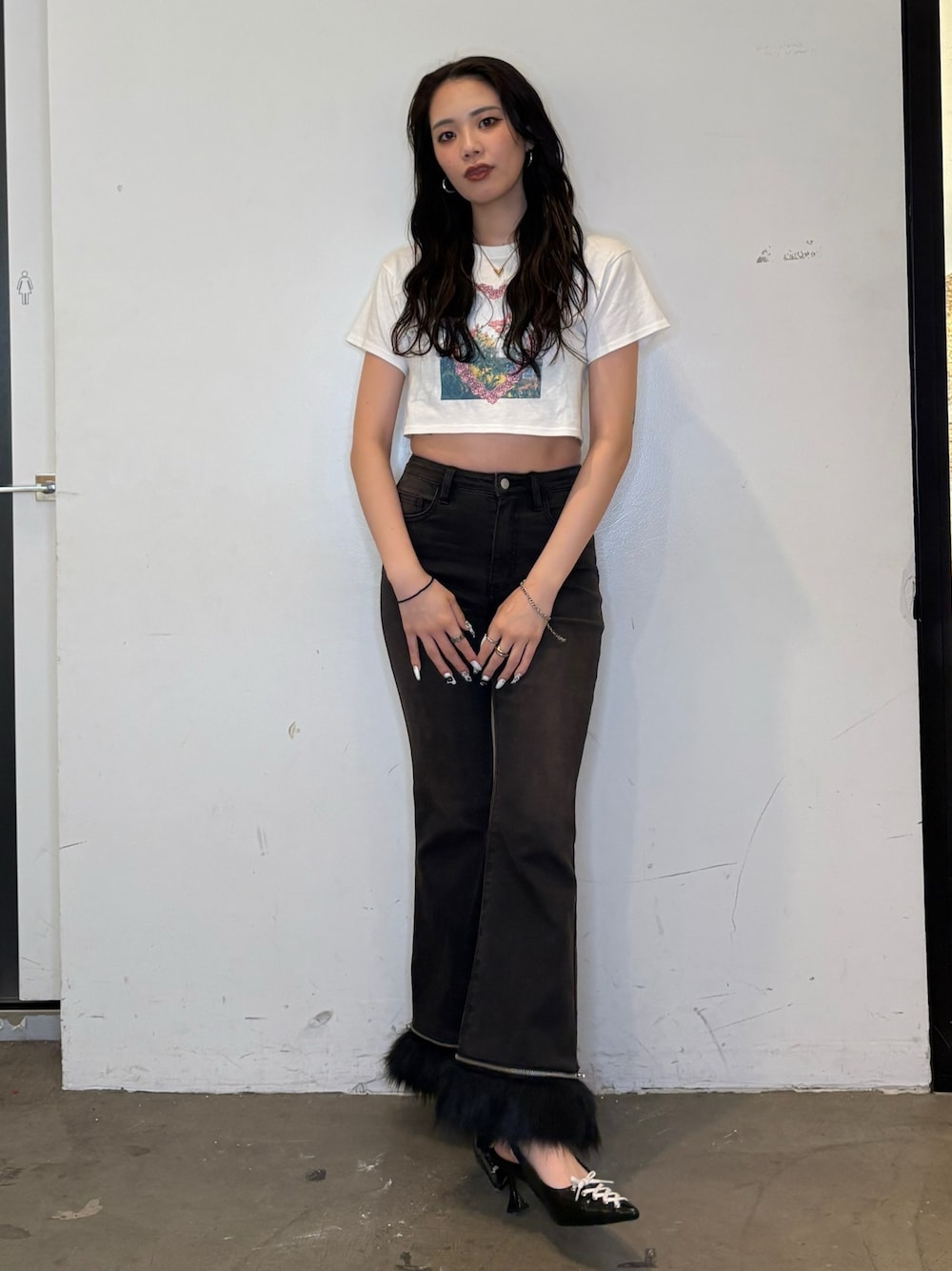 トレンドのフィットフレアのデニムです! とにかく伸びるので神シルエットを作り出してくれるデニムです! jouetieらしさを忘れない裾のファーがポイントです🫶🏻 取り外し出来るのでベーシックデニムでも使えちゃいます!