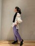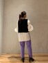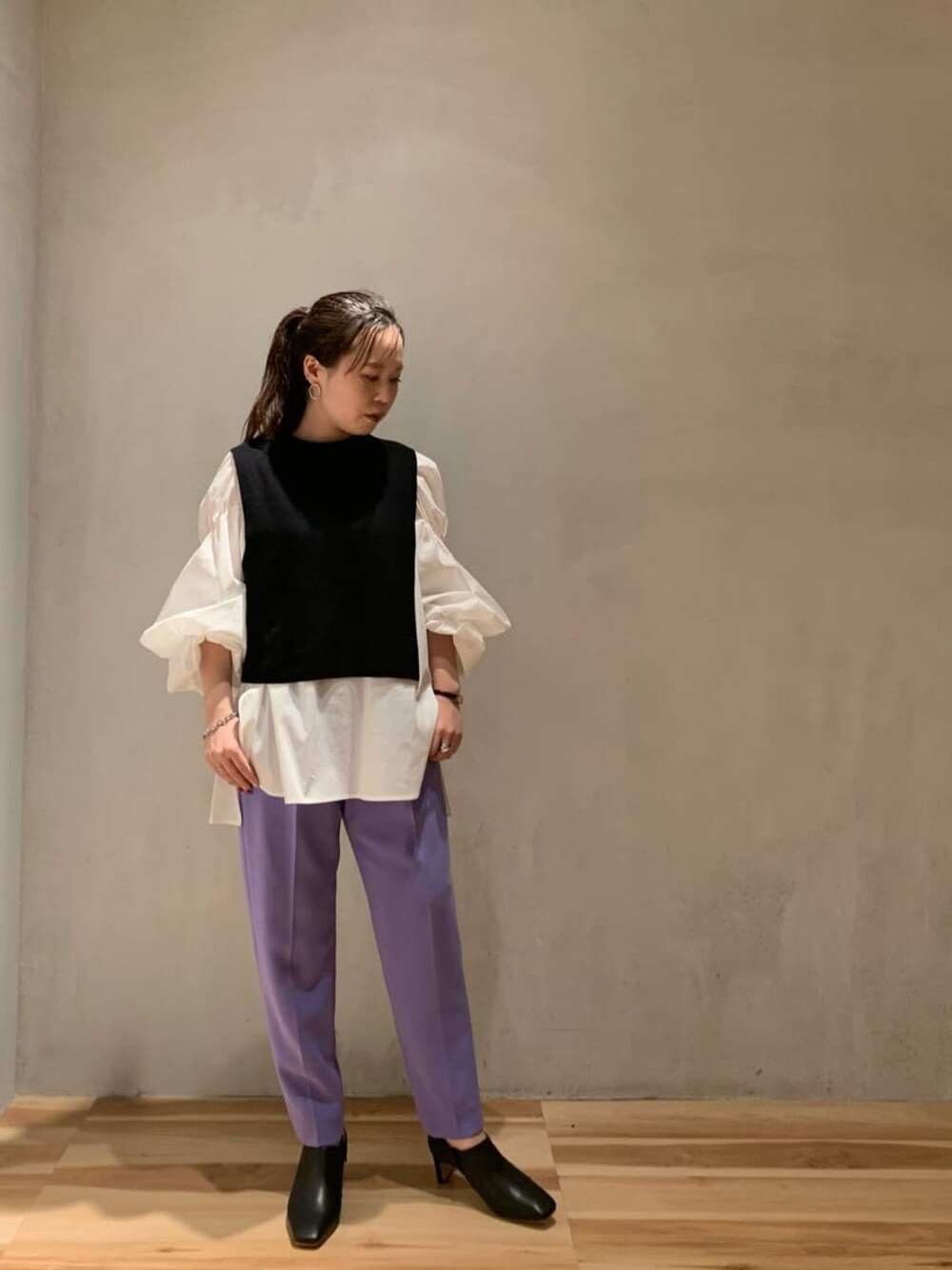 お袖のボリュームがかわいいブラウス×ニットベストのSETアイテム◎ブラウス、ベストは単体でも着ることが出来、着回し力抜群!これからの季節に大活躍間違いなしです。ゆるっと着れるトップスにELENDEEK定番のテーパードパンツを合わせたコーディネート。パープルのお色味でグッとオシャレ度が増します^^パンツはご自宅で水洗い可能なので、お仕事からおでかけまでデイリー使いにぴったりです◎155cmで01サイズ着用しております!