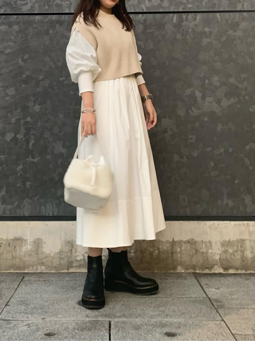 【ワンピース】ニットベスト×ワンピースのセットアイテム◎ベストはアシンメトリーなデザインで抜け感を演出。短め丈でスタイルアップが叶います◎ワンピースは人気のフィット&フレアシルエット。ウエストがゴムなので楽々なのにお腹周りをカバーしてくれる優秀アイテムです。155cm01サイズ着用。