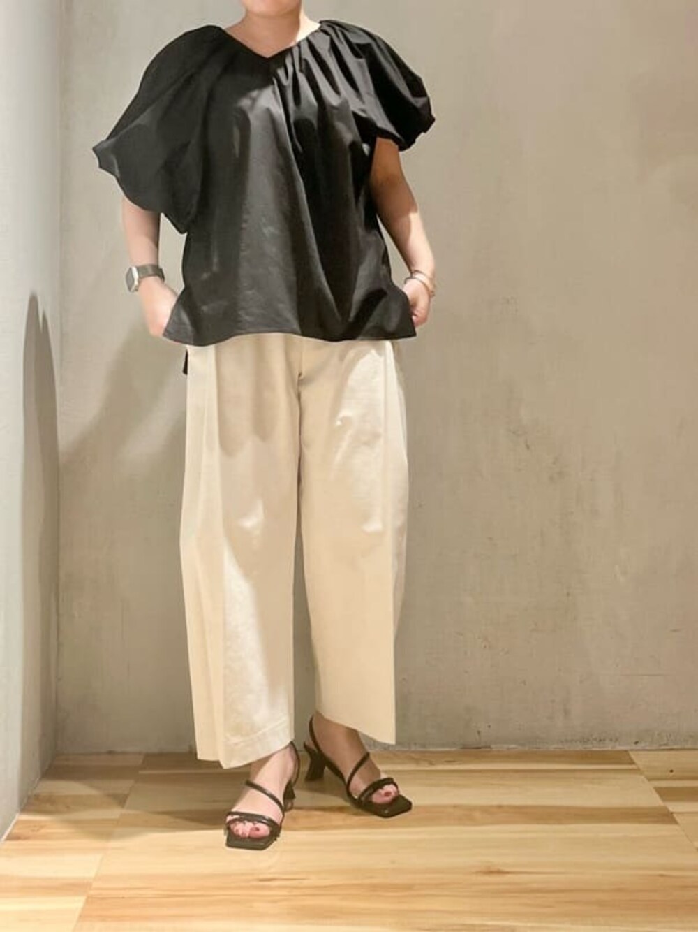 【トップス】バルーンスリーブがポイントのブラウス。お袖の長さがアシンメトリーになっているのでモードな雰囲気に◎【ボトムス】カラーによって素材がかわるゆるシルエットパンツ。着用のベージュはリネン素材で夏らしい印象に◎同じ素材のビスチェと合わせてセットアップでも着用可能。ウォッシャブル可能。155cm01サイズ着用。