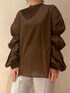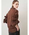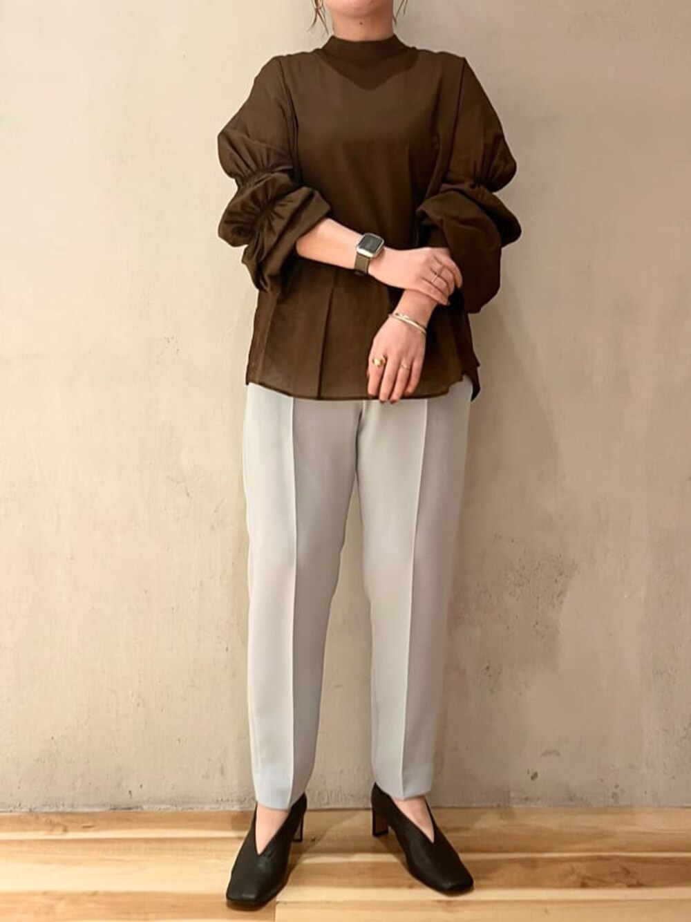 《お仕事にも◎今すぐ着れる秋スタイル》【ブラウス】ほどよい透け感が今年らしいブラウス。長袖ですが袖口にゴムが入っているのでたくしあげてもズレてこないのがポイント。ボリューム袖は羽織りに悩みがちですが、こちらのブラウスは薄手で柔らかいお素材なのでジャケットやアウターもらくらく着られました◎お首元も詰まっているのでほどよいかっちり感も◎【パンツ】1枚持っていれば安心の定番テーパードパンツ。着用カラーのアイスは店舗限定色。155cm01サイズ着用でお丈は裾上げいらずで着られるジャスト丈でした!シワになりにくくご自宅で洗えるのでデイリー使いにぴったり。合わせるアイテムでオフィスカジュアルからママコーデまで幅広くお使いいただけます。
