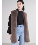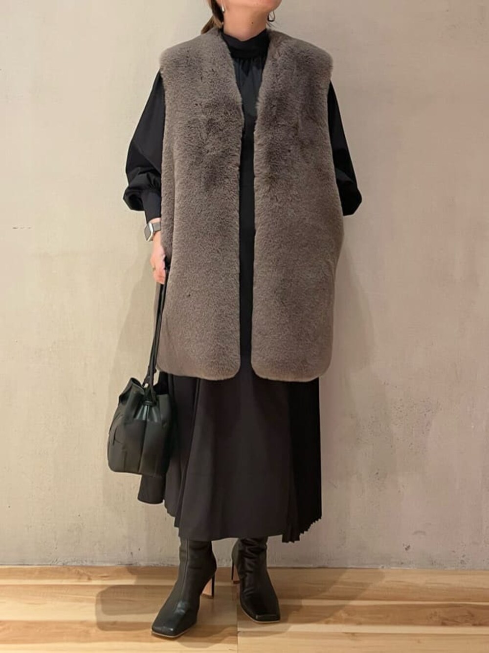 《CABLE VEST KNIT OP SETのワンピを着回し◎》【ワンピース】ワンピース×ニットベストSETのワンピをファージレと合わせたスタイリング◎サイドにプリーツがあしらわれており1枚でも映えるワンピース。さらりとしたお素材でシワにもなりにくくご自宅で洗えるのもうれしいポイント。【ジレ】トレンドのジレは手触りふわふわのフェイクファー。長めのお丈なのでストンと落ちるシルエットのアイテムとの合わせがオススメです◎【ブーツ】スクエアトゥブーツは秋冬コーデのマストアイテム。6.5cmのバーヒールで女性らしい印象に。