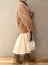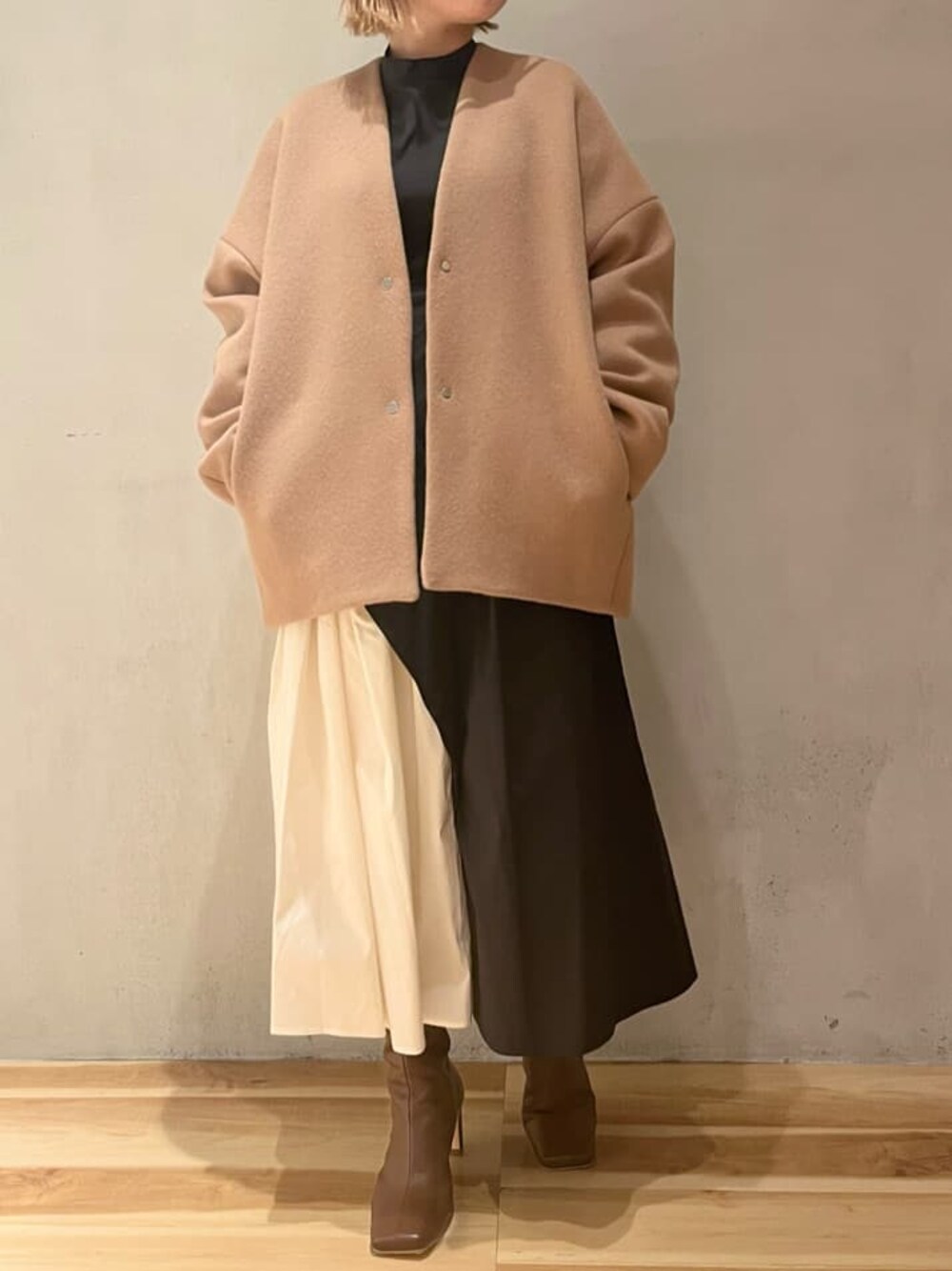 《10/13インスタライブ着用コーデ》【コート】ゆるっとシルエットのショートコート。ゆったりしているのでボリュームニットやデザイントップスの上からもらくらく羽織れます。ショート丈ですがお尻が隠れるお丈◎軽くて暖かいウール素材なので冬に大活躍間違い無しです。【ワンピース】ELENDEEKらしいアシンメトリーなデザインが目を引くワンピース。デザインはもちろん、ウエストラインがとってもきれいなので着痩せ効果も◎着用カラーのブラックはよりデザインが映える配色なのもお気に入りポイントです。155cm01サイズ着用です。