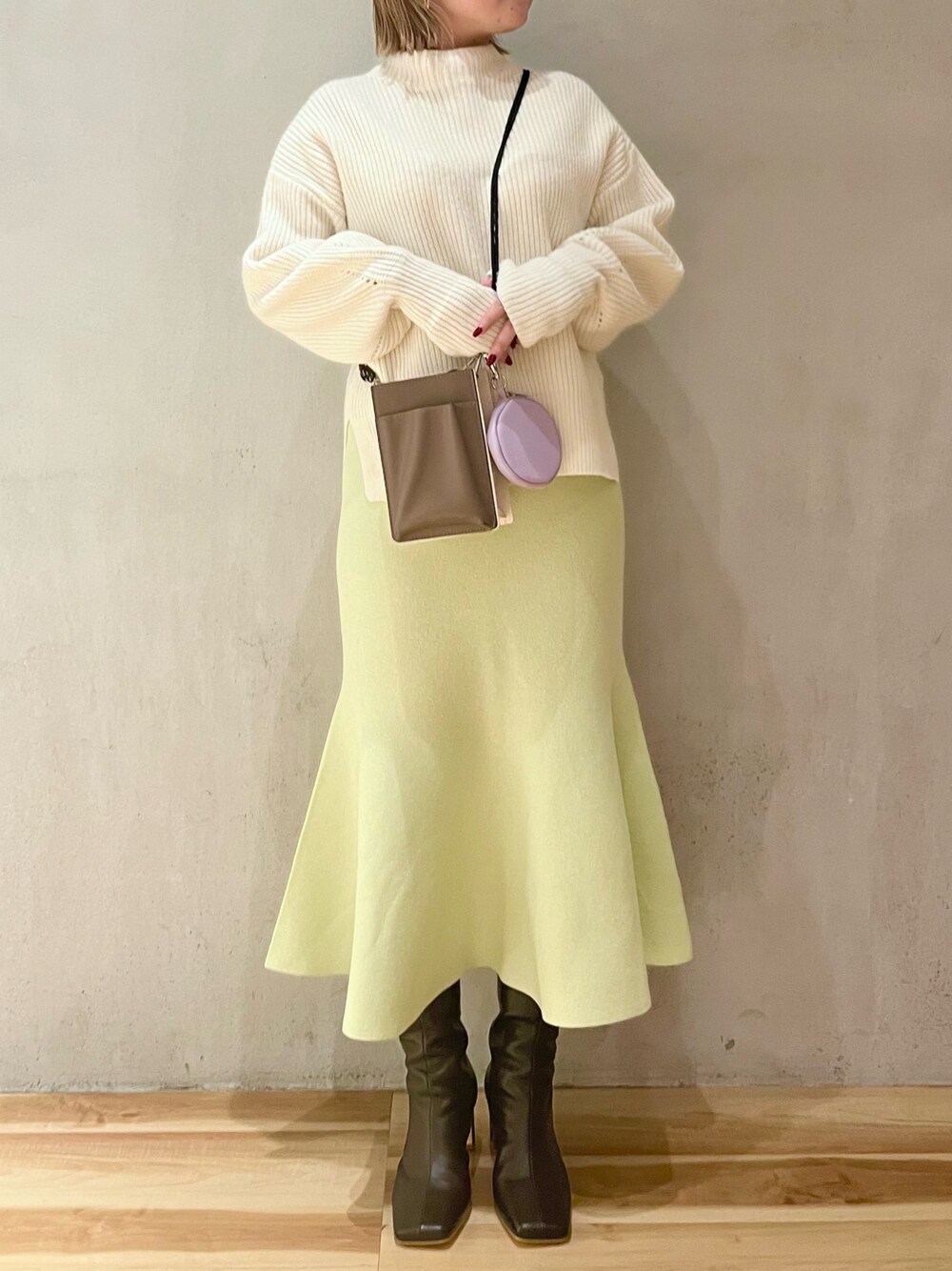 《春も着れちゃう冬アイテムコーデ》 【ニット】 ざっくり、ゆったりのニット🧶丈感は155cmでお尻が隠れる長めのタイプです☺️サイドにスリットが入っているので前だけをインスタイルするのもオススメ◎後ろと比べ前は少し短くなっているのでアウトスタイルも重たく見えません🤍 【スカート】 ニット素材のマーメイドスカート◎ほどよくラインがでる女性らしい1枚🤍ウエスト総ゴムなので脱ぎ着もらくちんです!155cm01サイズ着用☺️私は春に着てもかわいいライムをチョイスしました✔︎ 【バッグ】 お財布、スマホ、鍵などのお出かけの必需品がコンパクトにまとまるマルチバッグ👜3つのパーツはどれもお取り外し可能なのでお好きにカスタムしてお使いいただけます🤍