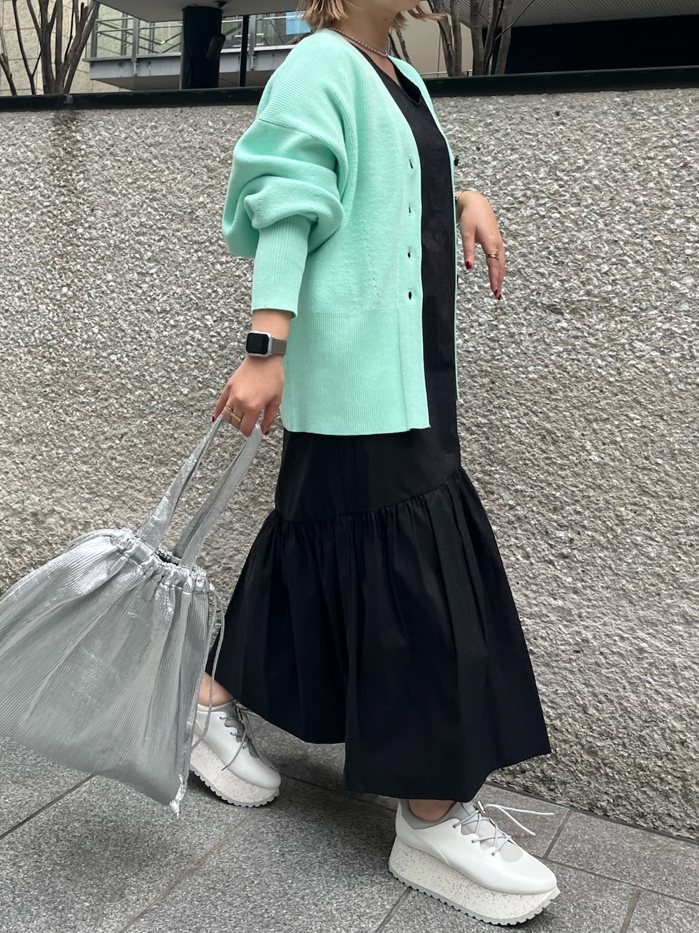 《春に着たいモードカジュアルコーデ》 【カーディガン】 155cmでお尻が隠れるお丈のカーディガン◎ゆったりとした抜け感のあるシルエットで羽織るだけでスタイリングのアクセントに🤍春は羽織、冬はコートインしてニットトップスとしても着られます☺️ 【ワンピース】 ブルゾン×ワンピースのセットアイテムのワンピを着回し◎裾の切り替えと内側に入るコクーンシルエットがポイント🤍広がりを抑えることでモードな印象+小柄さんでも安心なデザインです☺️155cmで01サイズ着用✔︎くるぶしより少し上でジャストなお丈でした◎セットのブルゾンもかわいいのでぜひご覧ください👀✔︎ 【ネックレス】 シンプルなスタイリングに映えるボールチェーンネックレス。シルバーをチョイスしてモードな雰囲気に💐 【バッグ】 マザーバッグ、お仕事にもぴったりな大容量バッグ👜内ポケット付きでハンドルも肩から掛けられる長さなのもうれしい☺️ 【シューズ】 大人気の厚底スニーカーのNEWバージョンが登場☺️靴紐はアジャスタータイプなので解ける心配もなく着脱もらくらく◎片手で楽に履けるのでママさんにもオススメです!私は普段23.5cmで02サイズがぴったりでした!つま先がやや薄いタイプなので足の甲が高めでサイズが心配な方は1サイズ上げて中敷で調整していただくのもオススメです🤍