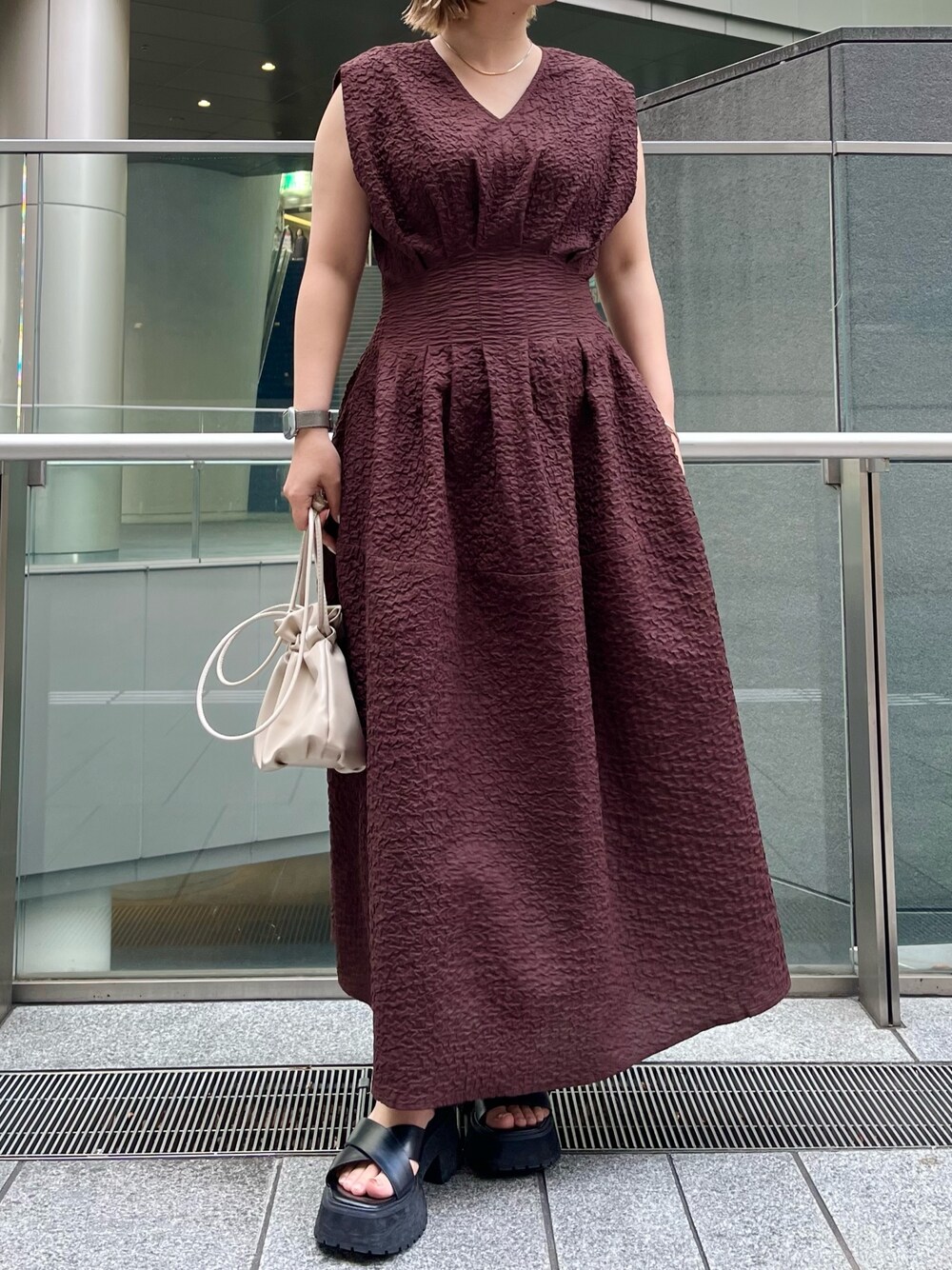 《大人のリラックスワンピース》 【ワンピース】 ジャガード素材の薄くて軽いワンピース。ウエストの後ろが太めのシャーリングになっており、着るだけでウエストラインがきれいに出る美シルエット。なのに締め付け感なくらくに着れる1枚🤍春はジャケットやブルゾンを重ねて、夏は1枚でさらりと涼しく。ご自宅で洗えるウォッシャブル仕様なので暑い日や旅行にもぴったり◎ 【ネックレス】 シルバーとゴールドの配色のバイカラーネックレス。細かなチェーンでお洋服のアクセントに◎着用カラーはシルバー(フロントがゴールドタイプ)です! 【サンダル】 左右のデザインが違うアシンメトリーのサンダルは女性らしいスタイリングのアクセントに🤍6cmのソールは安定感があり履き心地抜群。インソールにはクッションが入っているので長時間のおでかけも安心◎普段23.5cmですが、足の甲が高いので38(24-24.5cm)でジャストでした!