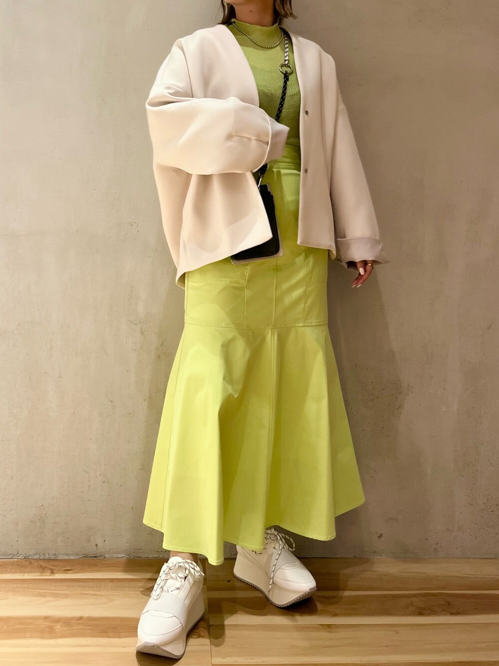 《モードカジュアルコーデ》 【アウター】 昨年大人気で即完売した丸いフォルムの春アウター◎ゆったりシルエットで小柄さんから長身さんまで幅広い方に愛されたアウターです!かっちりし過ぎずカジュアルにお召しいただけるシルエット。スカートはもちろん、パンツやワンピースとも相性抜群🤍155cmでお尻が隠れるお丈で安心。分厚めのインナーを着てもゆったり羽織れるアームの広さで季節の変わり目にぴったりな1枚です! 【ニット】 インナーにぴったりのシアーリブニット◎ウールが入っているので冬〜春のレイヤードスタイルにオススメの1枚です🤍私はコーディネートのアクセントになるライトグリーンをチョイス✔︎ 【スカート】 ハリ感のある上品なマーメイドスカート。腰回りがスッキリしているのでトップスをアウトスタイルで着てももたつきません◎ウエストの後ろがゴムになっているので履き心地もらくらくストレスフリー。裏地がついているので透け感もなく安心です☺️ 【バッグ】 スマホ、現金、カードなどの必需品がコンパクトに収まるマルチバッグ👜プレゼントにもオススメ🤍 【ネックレス】 シンプルなスタイリングに映えるボールチェーンネックレス。シルバーをチョイスしてモードな雰囲気に💐 【スニーカー】存在感のある厚底スニーカー、新色のホワイトが登場しました!ワンピース合わせにもバッチリ◎私は23.5cmで02サイズがジャストですが、スニーカーの甲の部分が薄めなのでゆったり履かれたい方は1サイズ上げてお選びいただくと安心です☺️厚底ですが安定感があり履き心地抜群!とっても軽いのでアクティブなおでかけにも安心です🤍