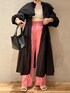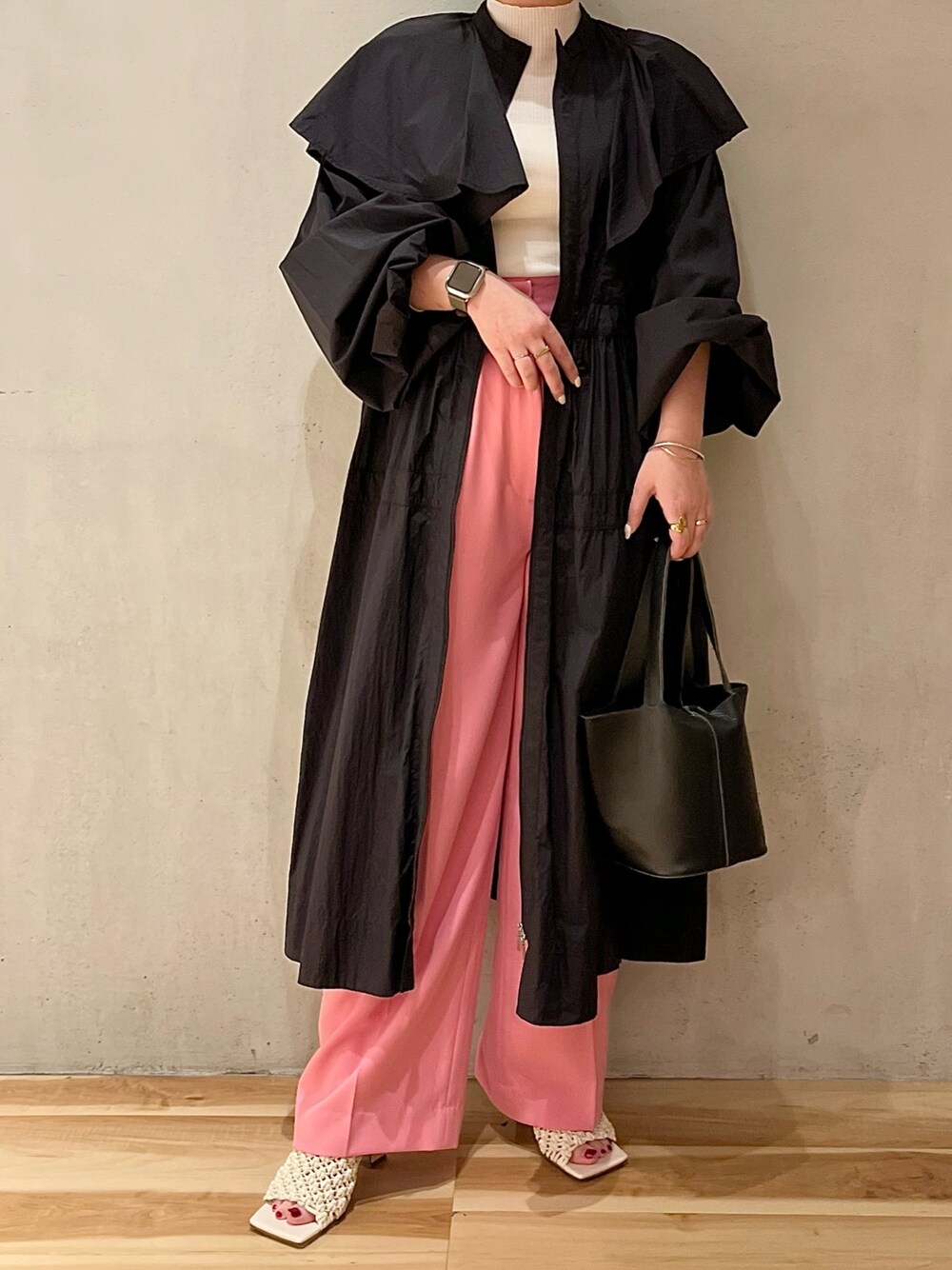 《モード好きのカラーコーデ①》 【アウター】 シャカシャカとしたナイロン素材のケープコート。とても軽い(約350g!)のでストレスフリーに羽織れるアウター◎脱いだ時も嵩張らずコンパクトに持ち運べるのもうれしいポイント。肩まわりのケープデザインで羽織るだけでモードな印象に☺️ウエストはゴムになっており、内側で絞りを調整できます!前を閉めて付属のベルトでウエストマークするとワンピースとしても着られます🤍155cm01サイズ着用。ご自宅で洗えるウォッシャブル仕様です! 【ニット】 インナーにぴったりのシアーリブニット◎ウールが入っているので冬〜春のレイヤードスタイルにオススメの1枚です🤍カラーアイテムと合わせやすいホワイトをチョイス✔︎ 【パンツ】 ピンクのワイドパンツ◎カラーアイテム、興味はあるけど着こなせるかな…?と不安な方は、ぜひボトムから取り入れてみてください☺️こちらのワイドパンツは身体のラインを拾いにくく履き心地も◎ウエストがややコンパクトめだったので155cm02サイズで着用しています。お丈は長めななので低身長さんはヒールや厚底スニーカーとの合わせがオススメ。ご自宅で洗えるウォッシャブル仕様です! 【バッグ】 牛革を使用した高見えバッグ◎中は巾着になっているのでキュッと縛れば貴重品も安心。マチが広めなのでしっかりお荷物も入ります☺️ 【サンダル】 セレクトアイテム:Mollini (モリーニ) のサンダル。フロントの編み素材がコーデのアクセントに◎ヒールは8cm。23.5cmで37size着用です!