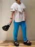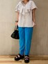 《夏に着たい!オトナのカラーパンツ》 【ブラウス】 ELENDEEK定番のフリルブラウス。肩まわりにボリュームがあるデザインですが、Vネックのほどよい肌見せで抜け感をプラス◎着用カラーのミックスはきちんと感もありつつほどよくカジュアルダウンしてお召しいただけます☺️ボトムはタイトシルエットを合わせてスッキリ見えがオススメ!155cmでお尻が隠れるお丈なので、着るだけで体型カバーもできちゃいます🤍夏にうれしいご自宅で洗えるウォッシャブル仕様◎ 【パンツ】 ELENDEEK定番のテーパードパンツ◎私はスタイリングのアクセントになる新色のパキッとブルーをチョイス☺️ゆったり着たかったので155cmで02サイズ着用、裾上げ無しでぴったりなお丈でした🤍 【サンダル】 ふかふかな履き心地のスリッパサンダル◎まるでクッションの上を歩いているかのようなふかふかさで疲れ知らず✌️どんなスタイリングにも合わせやすいようあえてシンプルなデザイン、カラーになっています☺️厚底ですがとても軽いのも安心🤍普段23.5cmで足の甲が高めなので38(24-24.5cm)着用、バンド部分も柔らかいので痛くありませんでした☺️